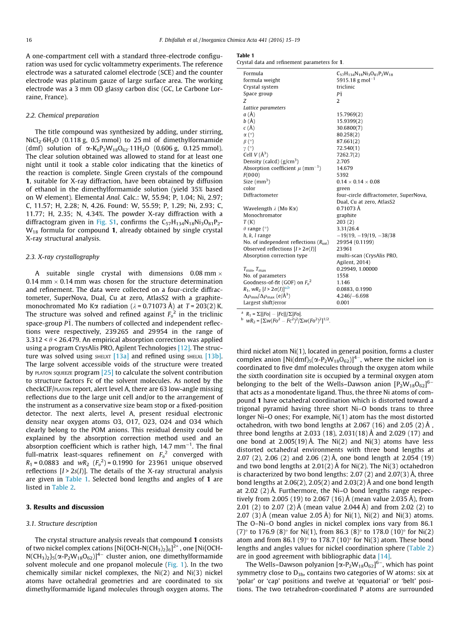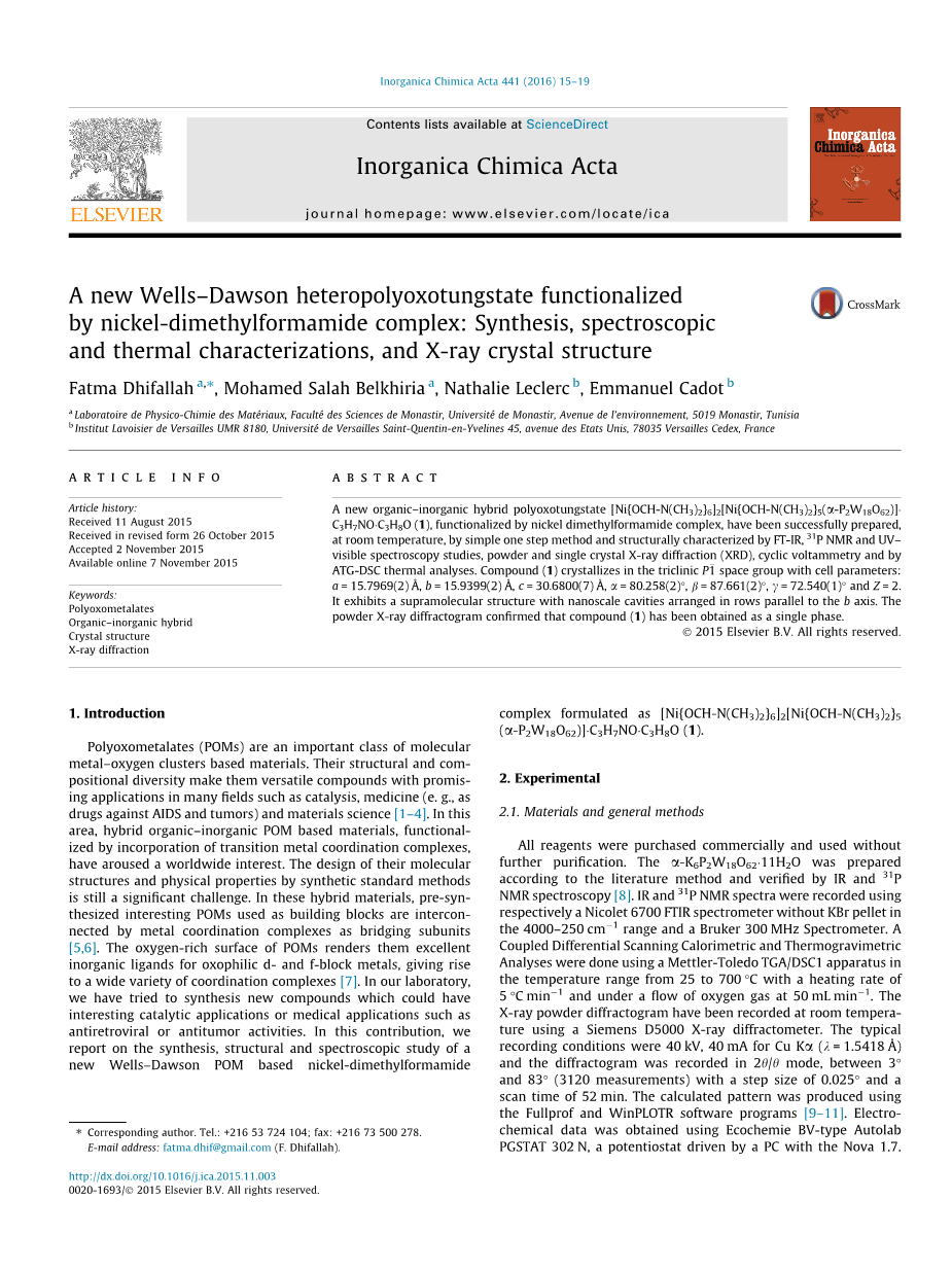 由镍-二甲基甲酰胺复合物功能化的新的Wells-Dawson杂多钨酸盐:合成,光谱和热表征以及X射线衍射晶体结构外文翻译资料
