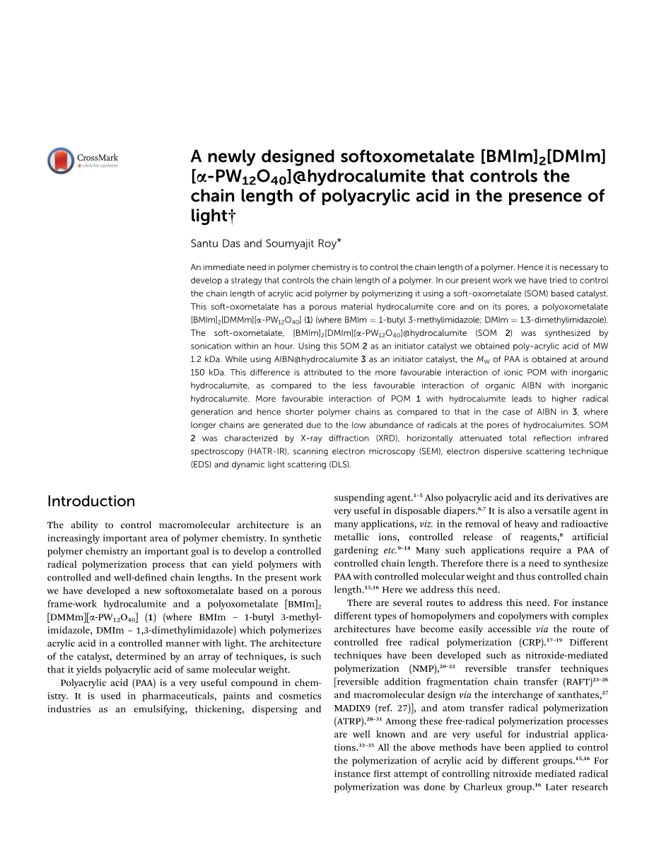聚合物化学中的一个迫切需要是控制聚合物的链长。因此,有必要制定一种控制聚合物链长的策略。在我们的工作中,我们试图通过使用软金属氧酸盐(SOM)催化剂来控制丙烯酸聚合物的链长。这种软金属氧酸盐在其孔上有一个多孔材料-水铝石芯,其孔隙上有多金属氧酸盐[BMIm]2[DMIm][alpha;-PW12O40](1)(其中BMIm=1-丁基3-甲基咪唑;DMIm=1,3-二甲基咪唑)。软金属氧酸盐[1-丁基-3-甲基咪唑]2[1,3-二甲基咪唑][alpha;-磷钨酸盐]@水铝石(SOM2)1小时内经超声合成。使用此SOM2作为引发剂,合成了分子量1.2 kDa的聚丙烯酸。同时使用偶氮二异丁腈@水铝石作为引发剂催化剂,才得到分子量在150 kDa左右的聚丙烯酸。这一差异是由于有机偶氮二异丁腈与无机水铝石的相互作用较弱,离子[BMIm]2[DMIm][alpha;-PW12O40]与无机水铝石的相互作用更为有利。与偶氮二异丁腈相比,聚甲醛更有利交互作用,水铝石导致了更高的自由基生成,从而缩短了聚合物链,而在偶氮二异丁腈的情况下,由于水铝石孔隙中自由基的饱和度较低,因此形成了较长的链。用X射线衍射(XRD)、水平衰减全反射红外光谱(Hatr-IR)、扫描电子显微镜(SEM)、电子散射技术(EDS)和动态光散射(DLS)对[1-丁基-3-甲基咪唑]2[1,3-二甲基咪唑][alpha;-磷钨酸盐]@水铝石进行了表征。