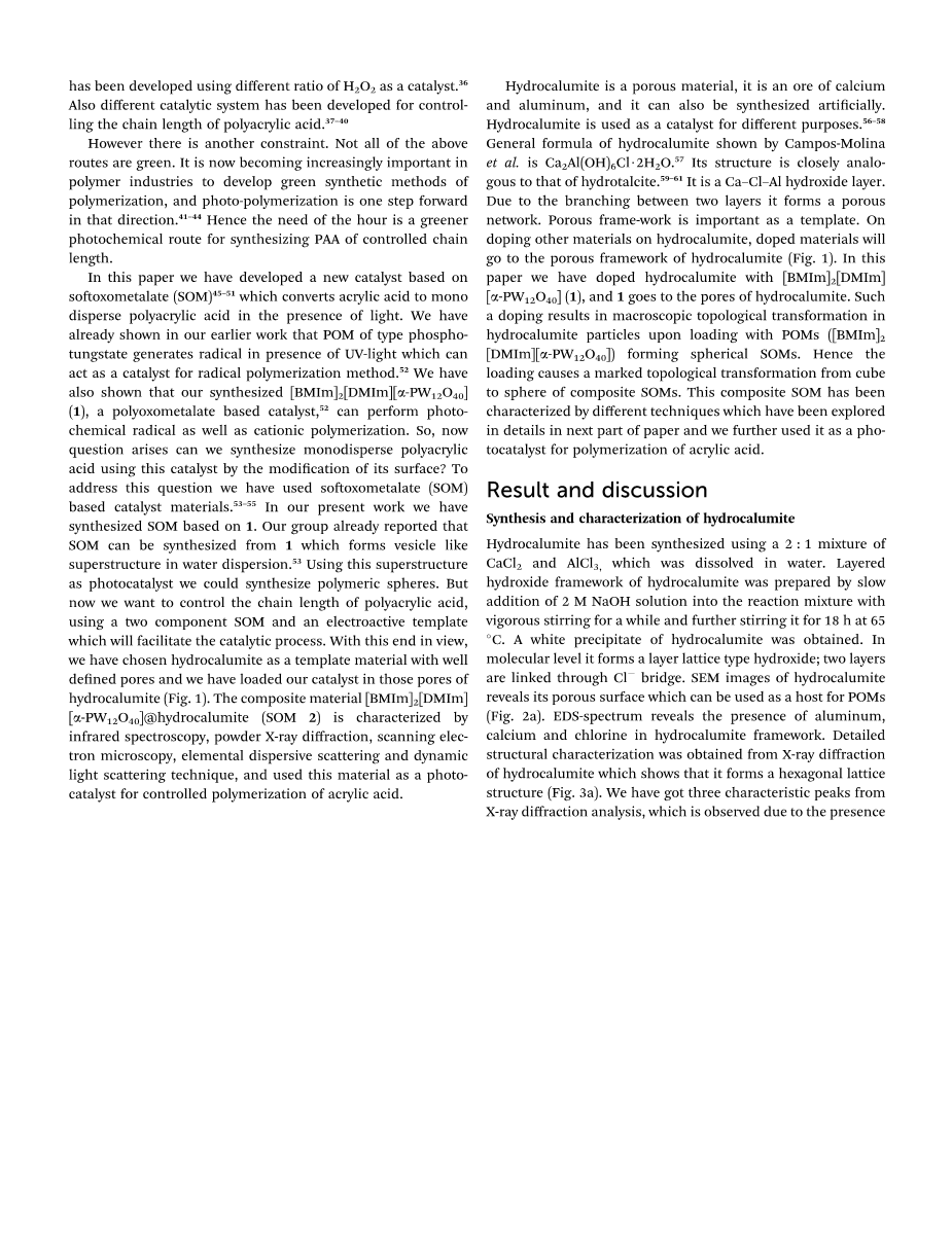 水铝石是一种多孔材料,是一种钙、铝矿石,也可以人工合成。水铝石是一种拥有不同用途的催化剂。56–58Campos-Molina等人提出水铝石的通用公式是2Al(OH)6Cl·2H2O 。57其结构与水滑石的结构十分相似。59–61它是一个钙-氯-铝氢氧化物层。由于两层间的分支,它形成了一个多孔网络。多孔框架作为模板是很重要的。在水铝石上掺杂其他材料时,掺杂材料将进入水铝石的多孔框架(图1)。在本文中,我们用[1-丁基-3-甲基咪唑]2[1,3-二甲基咪唑][alpha;-磷钨酸盐](1)掺杂了水铝石,以及将[1-丁基-3-甲基咪唑]2[1,3-二甲基咪唑][alpha;-磷钨酸盐]进入到水铝石的孔隙。这种掺杂导致了负载POMs([1-丁基-3-甲基咪唑]2[1,3-二甲基咪唑][alpha;-磷钨酸盐])形成球形SOMs时,水铝石颗粒的宏观拓扑转变。因此,加载导致了复合SOMs从立方体到球体的显著拓扑转换。对此复合材料已经进行了多种技术表征,并对其进行了下文详细的研究,我们进一步将其用作丙烯酸聚合的光催化剂。