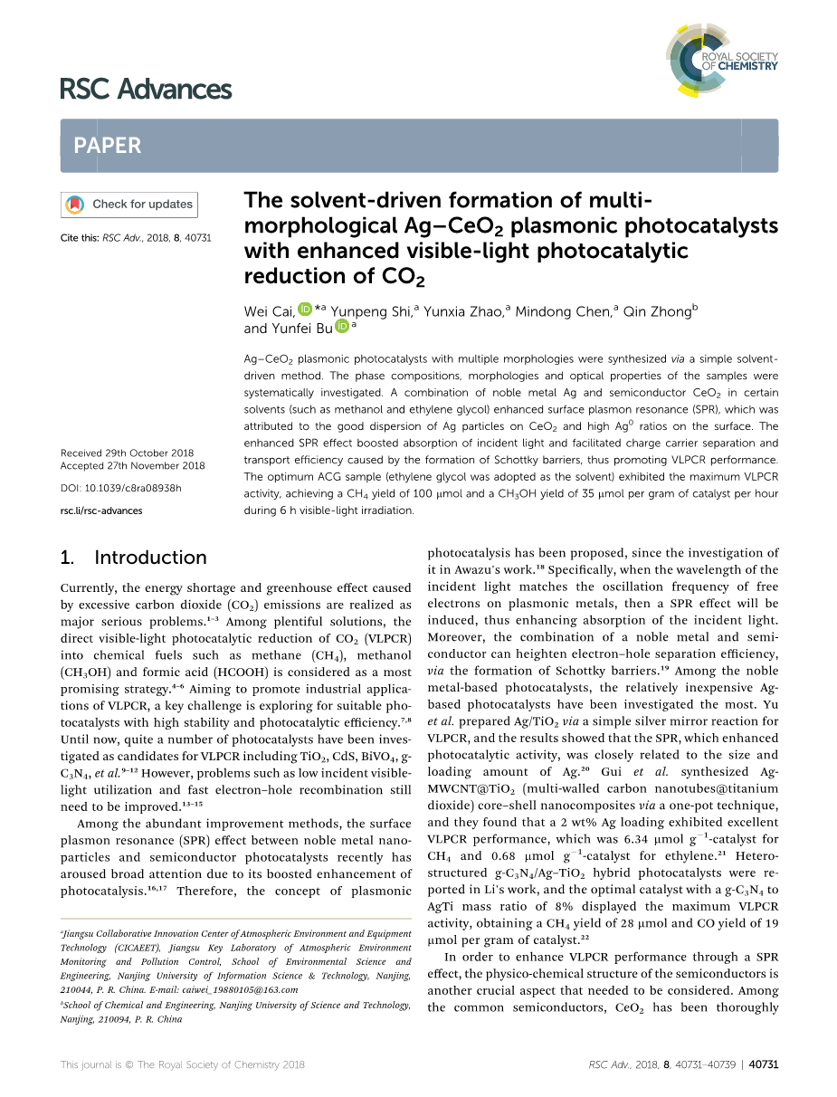 溶剂驱动形成多形态Ag-CeO2等离子体光催化剂,增强可见光光催化还原CO2