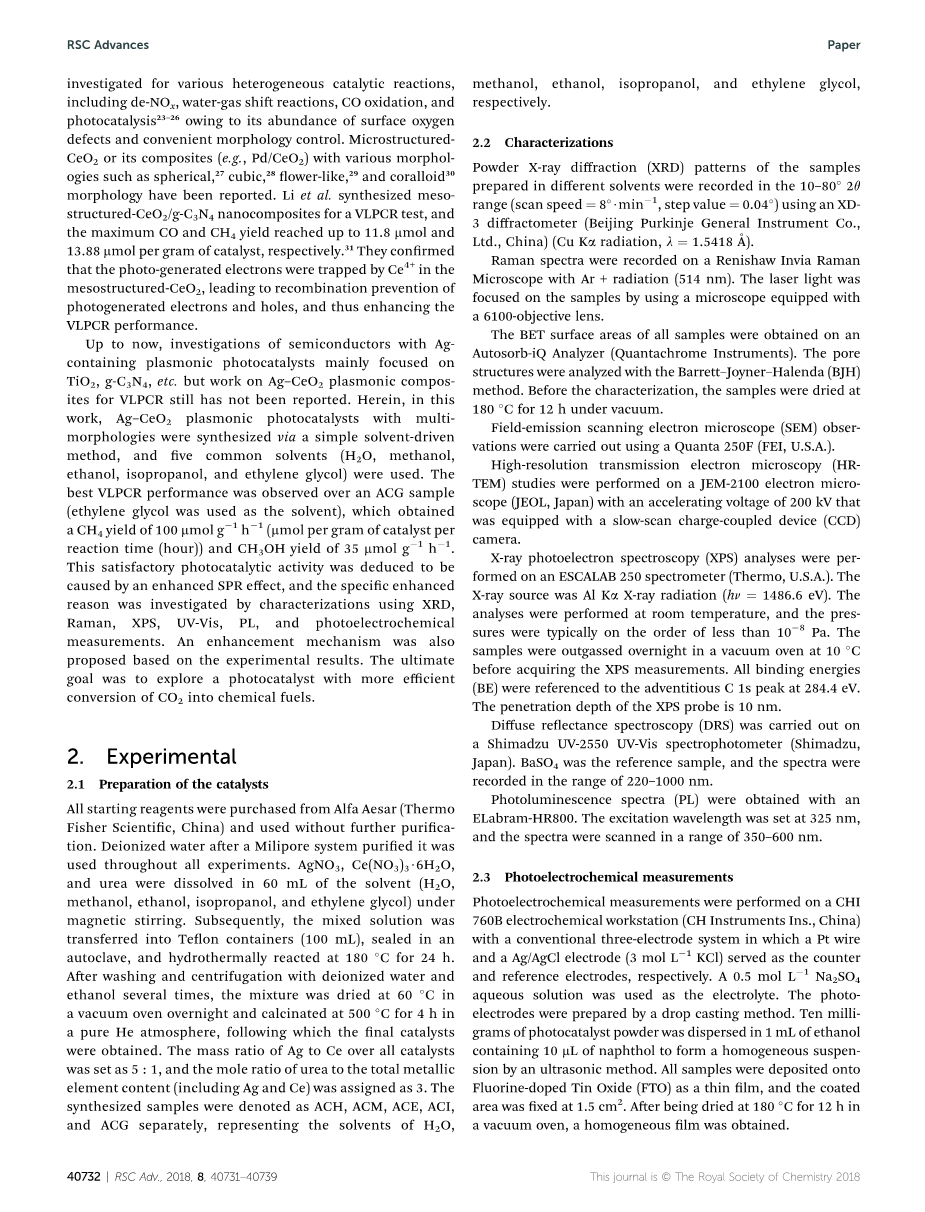 为了通过SPR效应增强VLPCR性能,半导体的物理化学结构是另一个需要考虑的关键方面。在常见的半导体中,CeO2已被彻底研究用于各种非均相催化反应,包括脱氮,水煤气反应,CO氧化和光催化23-26,因为它具有丰富的表面氧缺陷和方便的形态控制。已经报道了具有各种形态的微结构-TiO 2或其复合物(例如Pd / CeO 2),例如球形,27立方,28 like样,29和珊瑚状态30。李等人。合成介孔结构-TeO2 / g-C3N4纳米复合材料用于VLPCR测试,最大CO和CH4产率分别达到11.8mmol和13.88mmol / g催化剂.31他们确认光生电子被Ce4 捕获在介孔结构-TeO2中,导致重组,防止光生电子和空穴,从而提高VLPCR性能