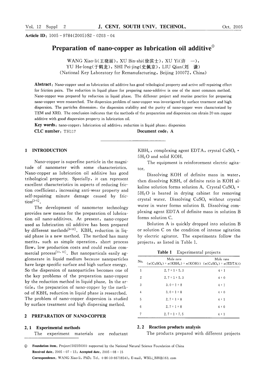 关键词:纳米铜;润滑油添加剂;液相还原法;分散