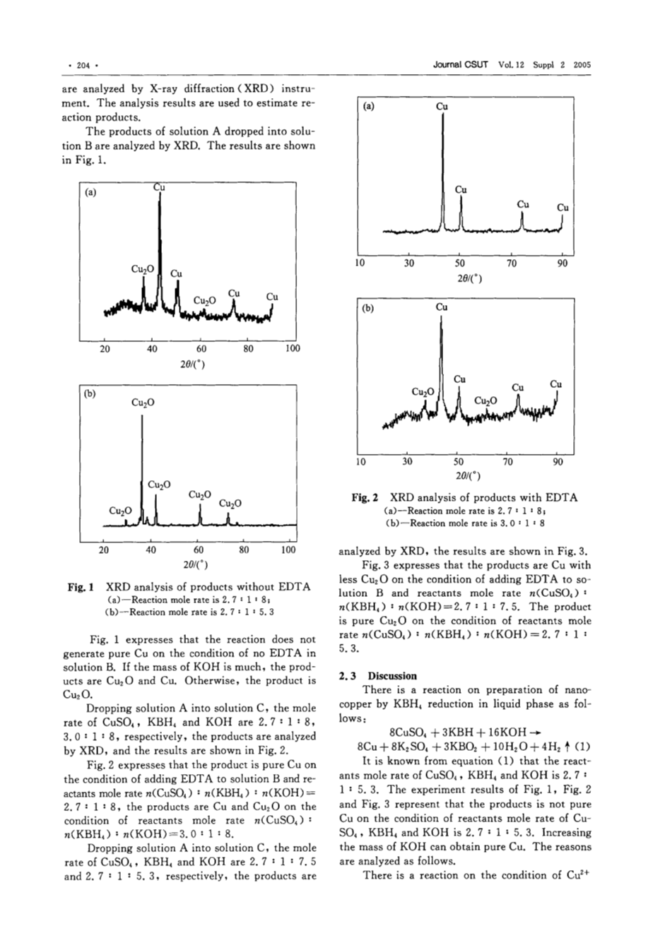 图2表示该产品是纯铜条件下加EDTA的溶液B,反应物摩尔比为n(CuSO4):n(KBH4)N(K O H)=2.7:1:8,该产品在铜和氧化亚铜下,反应物摩尔比n(CuSO4):n(KBH4):n(K O H)= 3.0:1:8。