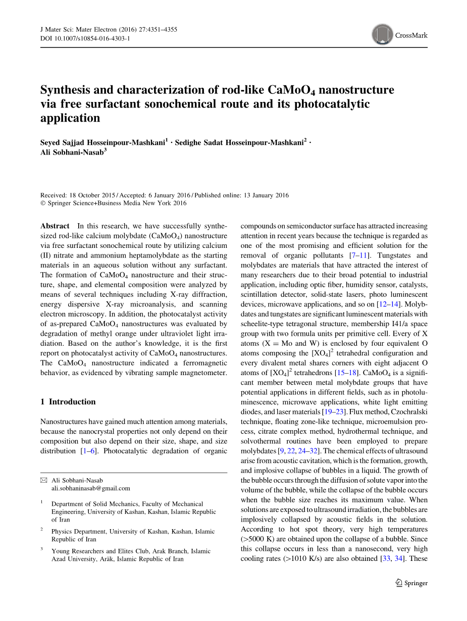 摘要:在这项研究中,我们通过无表面活性剂声化学路线(使用硝酸钙和钼酸铵作为原料在没有任何表面活性剂的水溶液)成功合成棒状纳米钼酸钙(CaMoO4)。纳米钼酸钙的形成、结构、形貌和元素组成通过一些技术分析,包括X射线衍射、能量色散X射线显微分析和扫描电子显微镜。另外,所制备的纳米钼酸钙的光催化活性由在紫外光照射下甲基橙的降解来评估。据作者所知,这是第一次报道纳米钼酸钙的光催化活性。根据振动探针式磁强计表明,纳米钼酸钙显现出铁磁性。