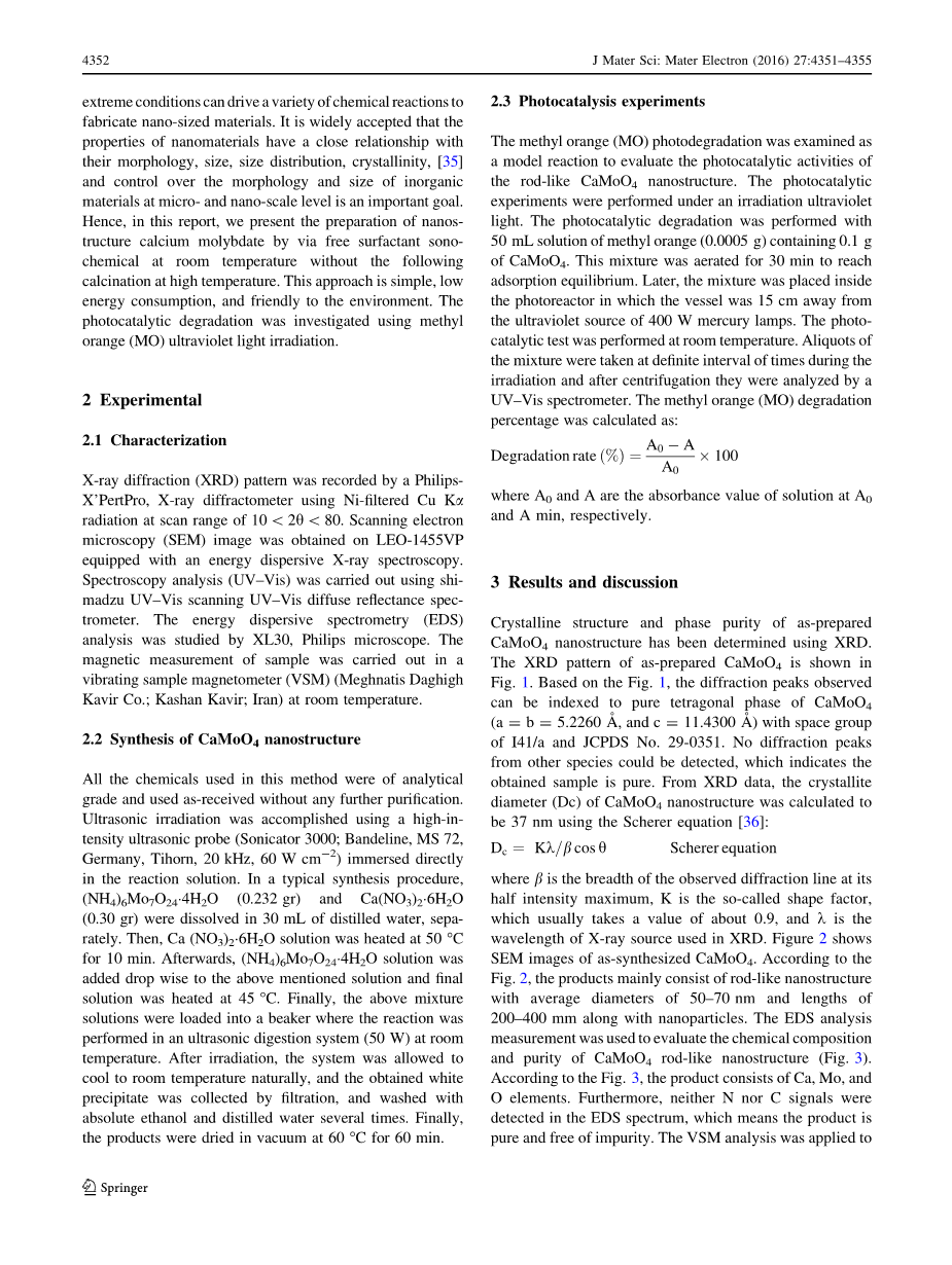 纳米材料在材料中得到了广泛的关注,因为纳米晶体性能不仅取决于它们的组成也取决于它们的尺寸、形貌和粒径分布[1-6]。在半导体表面的有机化合物的光催化降解近年来引起了越来越多的关注,由于该技术被认为是用于去除有机污染物的最有前途的和有效的解决方案[7-11]。钨酸盐和钼酸盐材料已经引起了许多研究者的兴趣由于它们广泛的应用潜力,包括光纤、湿度传感器、催化剂、闪烁探测器、固体激光器、光致发光器件、微波应用等[12-14]。钼酸盐和钨酸盐是重要的拥有白钨矿型四方结构的光致发光材料,拥有I41/a空间群。每一个X原子(X = Mo和W)是由组成等效[ XO4 ] 2四面体构型的四个氧原子所包围,每一个二价金属由XO4四面体的相邻八个O原子所共享[15-18]。CaMoO4是金属钼酸盐中的重要成员,在不同领域拥有潜在的应用,例如:光致发光、微波应用、白光发光二极管和激光材料[19-23]。熔剂法、提拉法、浮动区法、微乳法、柠檬酸络合物法、水热法、溶剂热法已经被用于制备钼酸盐[9,22,24-32]。由声空化产生的超声化学效应,这是在液体中的气泡形成、生长,并内爆破裂。气泡的生长是通过溶质蒸气扩散到气泡体积中而产生的,而当气泡达到最大值时,气泡的破裂就发生了。当溶液暴露于超声波放射中,气泡在溶液中由于声场而内部破裂。根据热点理论,非常高的温度(gt;5000K)能在气泡破裂时获得。由于这个破裂发生不到一纳秒,泪却效率非常的高(gt;1010K/s)[33,34]。这些极端的条件能够驱动各种化学反应来制备纳米材料。人们普遍认为,纳米材料的性质与其形貌、尺寸、粒度分布、结晶度、[35]之间有着密切的关系,控制无机材料在微米和纳米尺度上的形貌和尺寸是一个重要的目标。因此,在这个报告中我们提出了通过通过无表面活性剂超声法在常温下制备纳米钼酸钙并且无需通过高温焙烧。这种方法简单、能耗低并且对环境友好。并且通过紫外光照射甲基橙(MO)进行光催化降解的研究。