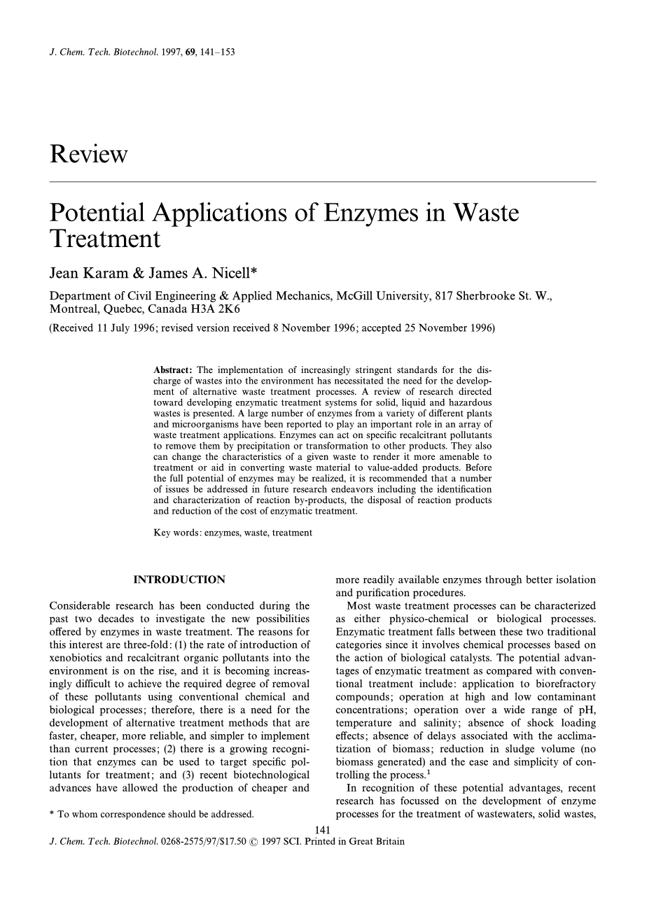 无论是物理化学或生物过程,大多数废物处理过程都可以表征。酵素处理介于这两个传统类别之间,因为它涉及化学过程的基础的同时还有生物催化剂的作用。与常规治疗相比,酵素处理的潜在优势在于:对难降解化合物的应用;能在高、低浓度的污染中运行; 能在很宽的PH、温度、盐度范围内操作;无冲击负荷影响;生物适应性无延迟;减少污泥量(没有生物质产生)和控制过程的简单性和便捷性。