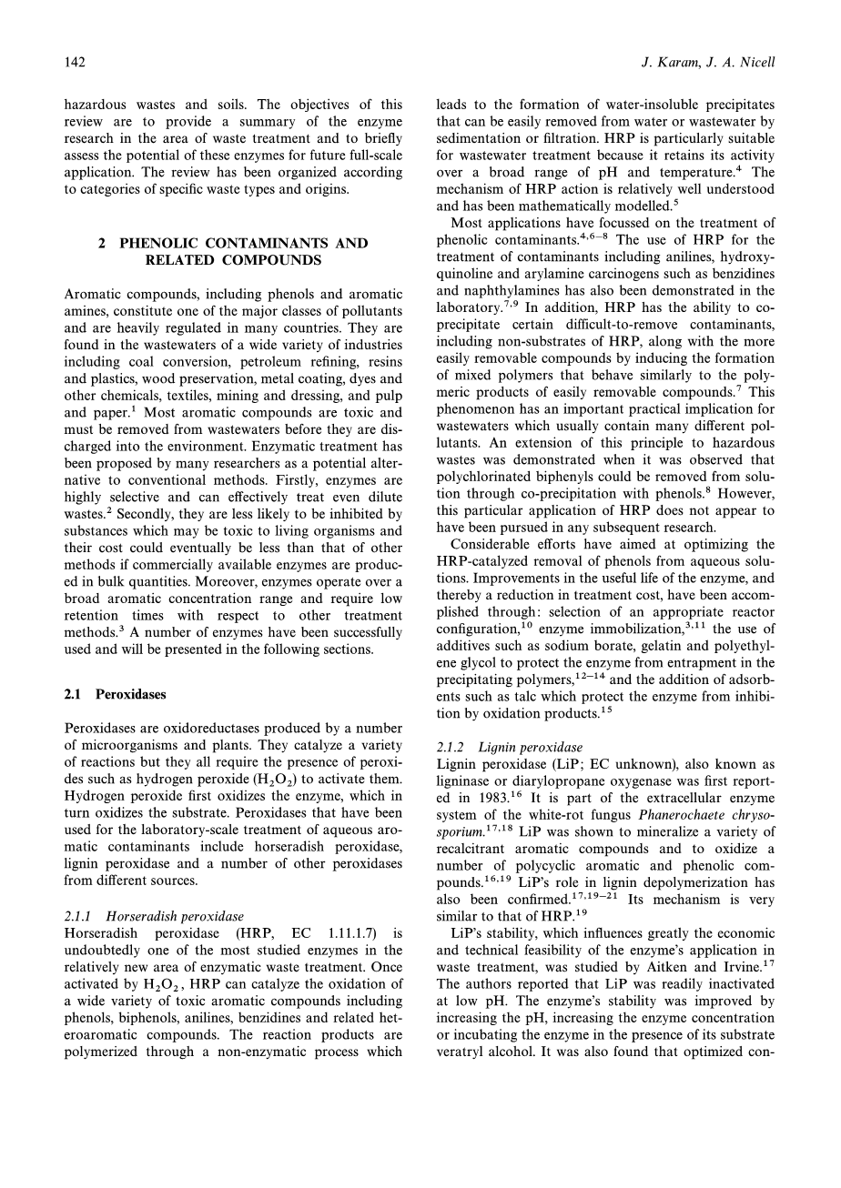 HRP行动的机制比较好理解,并且已经被数学模型化了。大多数应用都集中在酚类污染物的处理上。使用HRP处理污染物,包括苯胺,羟基喹啉和芳胺致癌物质如联苯胺和萘胺也已在实验室中得到证实。此外,HRP有能力协调沉淀某些难以去除的污染物,包括HRP的非底物,以及通过诱导与容易除去的化合物的聚合物产品类似的混合聚合物的形成,以及可移除的化合物。这种现象对于通常含有许多不同污染物的瓦斯有重要的实际意义。这种现象对于通常含有许多不同污染物的瓦斯具有重要的实际意义。当观察到可以通过与酚共沉淀从溶液中除去多氯联苯时,证明了这一原理对危险废物的延伸。然而,HRP的这种特殊应用似乎并没有在随后的任何研究中进行。相关努力旨在优化从水溶液中去除酚类的HRP。 已经通过以下方式实现了酶的使用寿命的改善,从而降低了处理成本:选择合适的反应器配置,酶固定,使用添加剂如硼酸钠,明胶和聚乙二醇来保护酶不会沉淀在沉淀聚合物中,以及添加吸附剂如滑石,保护酶免受氧化产物的抑制。