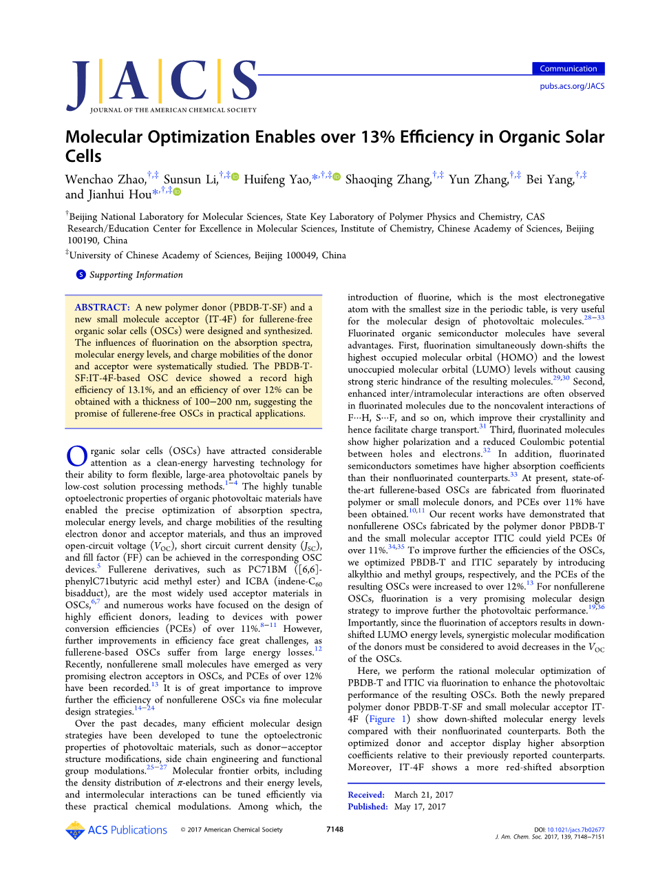 在这里,我们通过氟化进行PBDB-T和ITIC的合理分子优化,以提高所得OSCs的光伏性能。与未氟化的对应物相比,新制备的聚合物供体PBDB-T-SF和小分子受体IT-4F(图1)显示降低的分子能级。优化的供体和受体相对于先前报道的对应物显示出更高的吸收系数。此外,IT-4F显示出比ITIC更红移的吸收光谱,而供体具有几乎相同的吸收带隙。具有PBDB-T-SF:IT-4F的OSCs获得了13%的经证实的PCEs装置,据我们所知,这是迄今OSCs文献中报道的最高值。