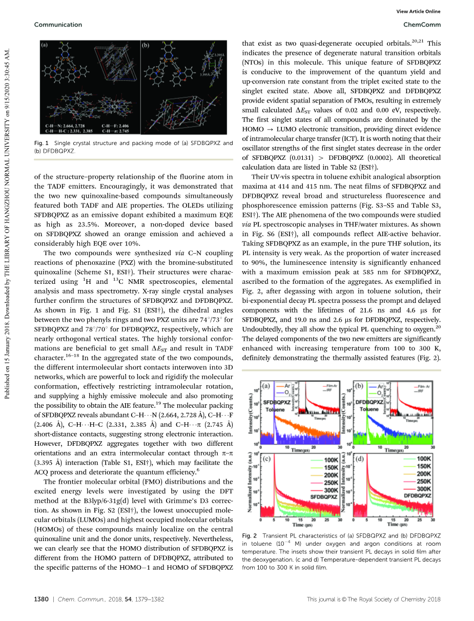 本文报道了一种新的分子设计方法来提高普通TADF发射体的颜色纯度和解决发射光谱较宽的问题。本文设计了一个目标分子,其骨架中心处具有连锁的给体部分,且主结构中的电子给体-受体部分具有较小的单线态-三线态能级差(Delta;EST)。通过基于连锁的给体单元分子设计的靶分子与参考分子的比较,发现连锁的给体结构对降低半峰宽、获得深蓝光的发射光和高EQE至关重要。基于新的分子设计方法的TADF发射体,本文制备了半峰宽仅为48 nm,EQE为14.0%,深蓝光坐标为(0.14, 0.12)的深蓝光TADF器件。