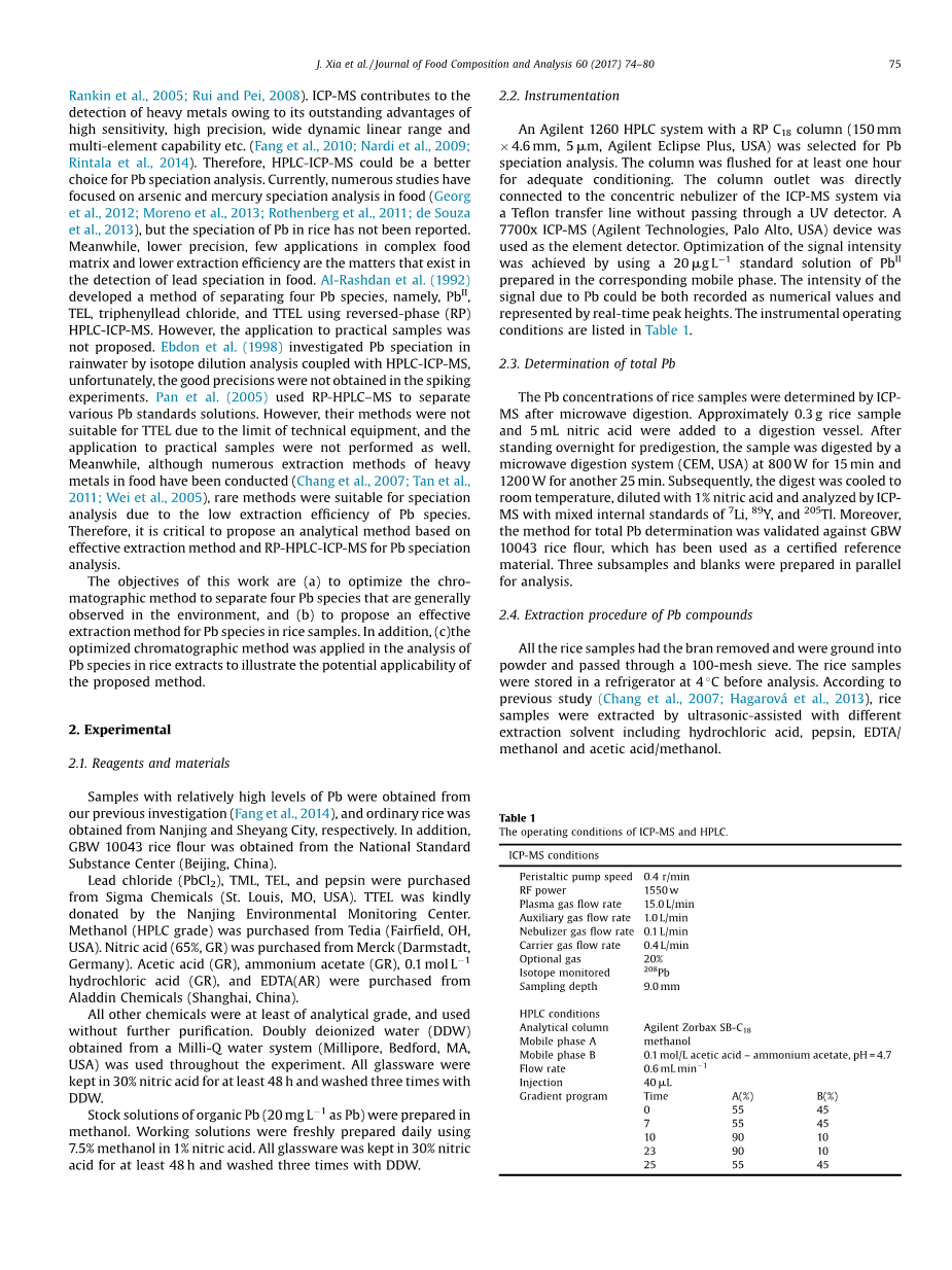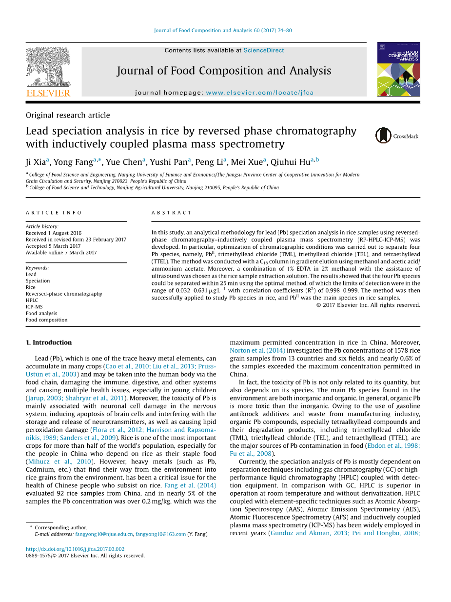 关键词:铅形态;大米;反相色谱;HPLC;ICP-MS;食品分析;食品成分