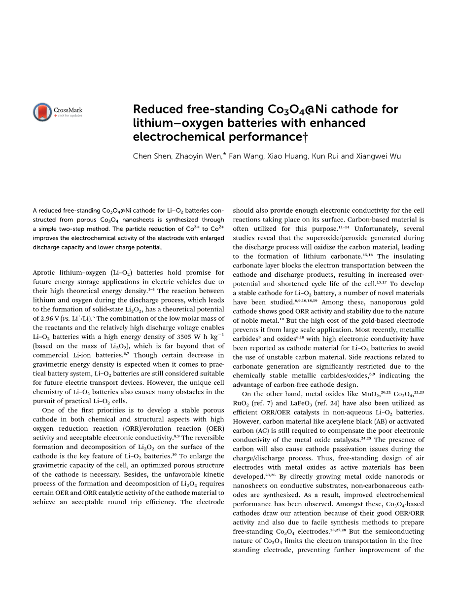 通过一个简单的两步合成法合成由多孔Co3O4纳米层构成的锂空气电池的还原性自支撑钴酸镍复合阴极材料。Co3 到Co2 的还原增大了放电容量,降低了充电电位,从而提高了电极的电化学活性。
