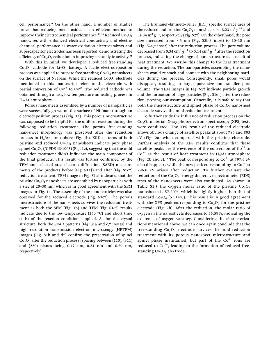 总之,我们研发了一个简单的还原过程来提高锂空气电池自支撑Co3O4阴极的电化学性能。通过电沉积法合成自支撑的Co3O4镍复合材料电极,然后在氢气/氩气气氛中进行温和的热处理以制备还原性电极,在还原处理后仍能保持初始电极的多孔纳米层形态和尖晶石的晶体结构,X射线光电子能谱结果表明还原后Co3 转化为Co2 。进一步的电化学测试表明,还原性阴极具有明显更高的电导率、更大的比容量,形成更小尺寸的Li2O2,在30圈循环之后,在充电和放电之间具有1.05V的稳定电势差,还原性电