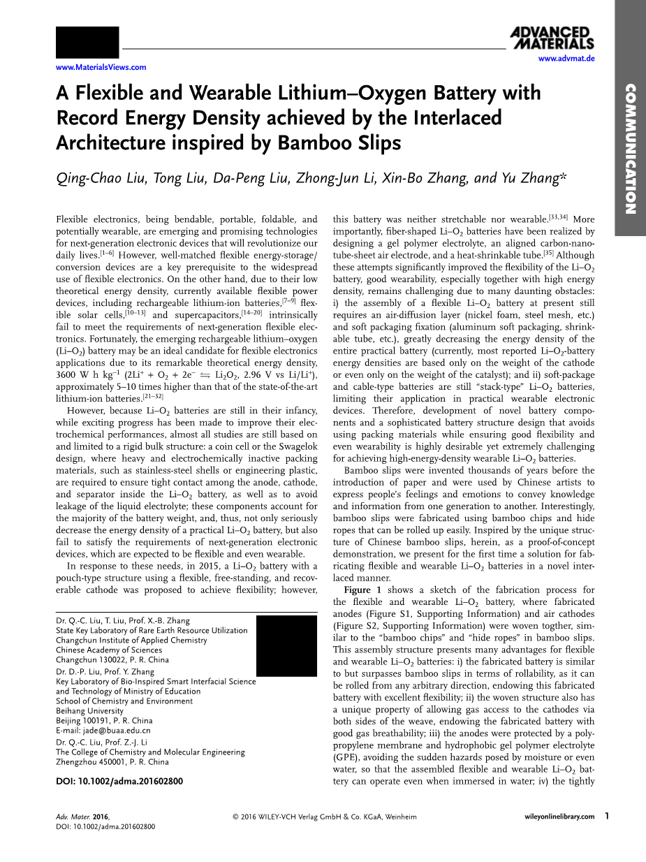 竹简是在纸张引入前数千年发明的,并且被中国艺术家用来表达人们的感觉和情感,以将知识和信息从一代传送到另一代。有趣的是,竹简是使用竹片和隐藏的绳索制造的,可以很容易地卷起。 灵感来自中国竹筏的独特结构,在这里,作为概念验证示范,我们第一次提出了用一个新颖的镶嵌方式制造柔性和可穿戴的Li-O2电池的解决方案。