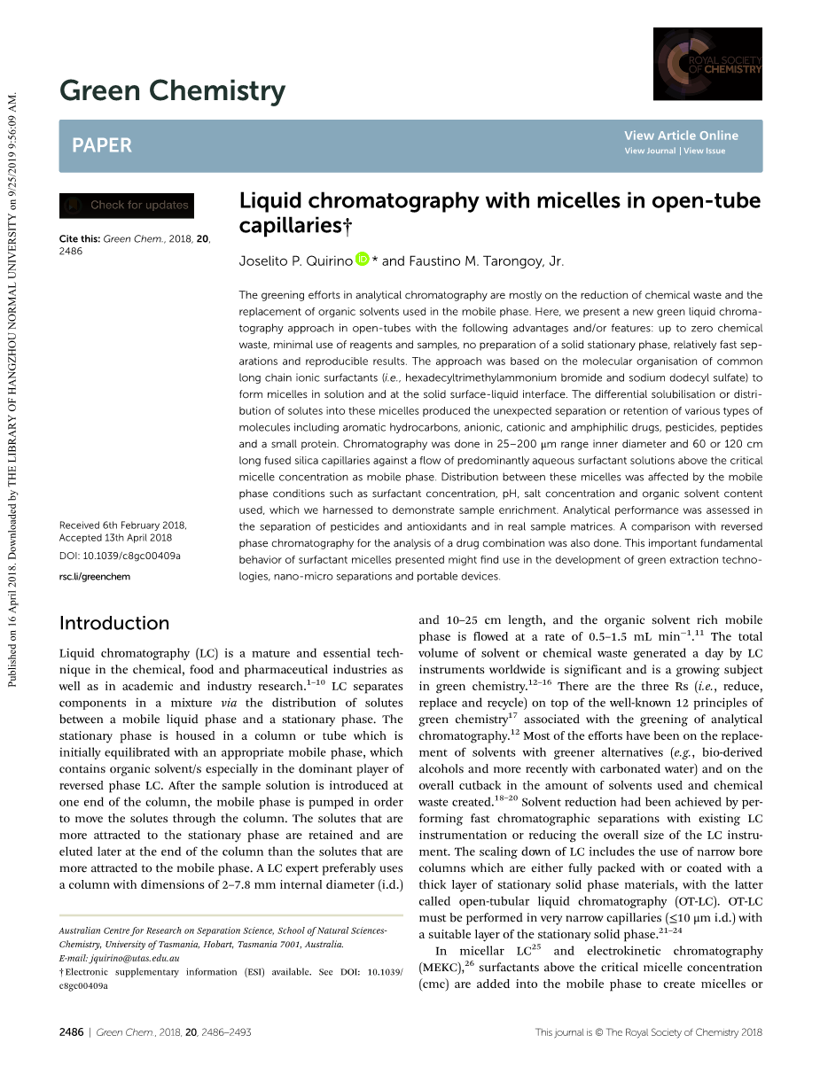 摘要:分析色谱法中的绿色效应主要在于化学废物的减少和替代流动相中使用的有机溶剂。在这里,我们介绍了一种新的开放管绿色液相色谱方法,它具有以下优点:化学废物可高达零,试剂和样品的使用量最少,无需制备固相固定相,分离速度相对较快和结果可再现。该方法是基于常见的长链离子表面活性剂(即十六烷基三甲基溴化铵和十二烷基硫酸钠)的分子结构在溶液中以及在固体表面-液体界面处形成胶束。溶质在这些胶束中的不同溶解或分布导致了各种类型的分子意外分离或保留,包括芳香烃,阴离子,阳离子和两亲性药物,农药,肽和小蛋白质。色谱分析是在25-200mu;m范围内径和60或120 cm长的熔融石英毛细管中进行的,流动相为高于临界胶束浓度的主要表面活性剂水溶液。这些胶束之间的分布受流动相条件的影响,例如使用的表面活性剂浓度,pH,盐浓度和所用有机溶剂含量,我们利用这些条件来证明样品的富集。在农药和抗氧化剂的分离以及实际样品基质中评估了分析性能。还进行了与反相色谱分析药物组合的比较。表面活性剂胶束的这一重要的基本操作可能会在绿色萃取技术,纳米微分离和便携式设备的开发中得到应用。