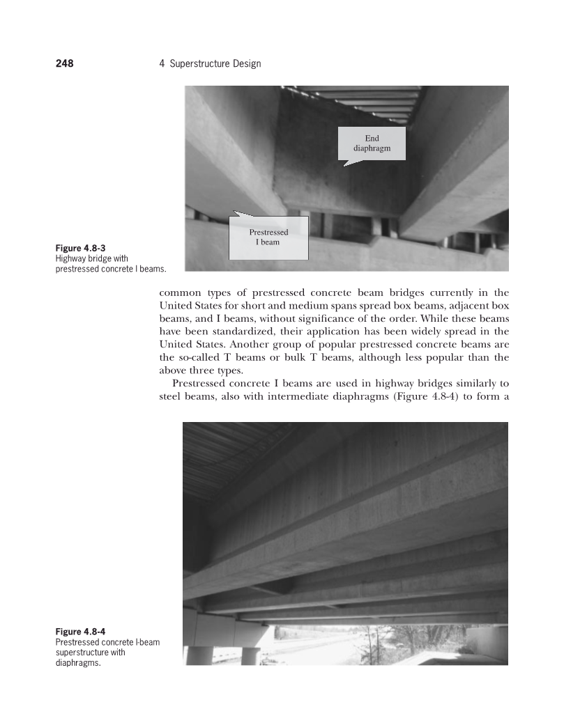 预应力混凝土I梁类似于钢梁,也与中间隔膜(图4.8-4)一起用于公路桥梁,以形成上层建筑框架。他们是为适应钢梁的直线和倾斜的结构。另一方面,预应力混凝土箱梁只能用于具有小倾斜角的结构。例如,一些桥梁业主限制预应力混凝土箱梁与以下30◦倾斜角度的跨度。除了这个限制外,扩展箱梁上层结构的工作方式与其横梁对应部分相对于梁间距,相关桥面板厚度等工作。