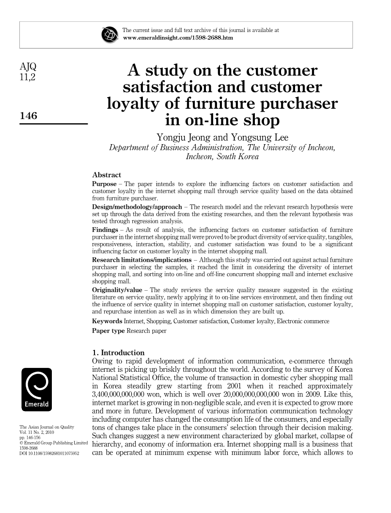 外文原文文献: A study on the customer satisfaction and customer loyalty of furniture purchaser in on-line shop