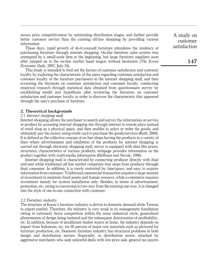 can be operated at minimum expense with minimum labor force, which allows tosecure price competitiveness by minimizing distribution stages, and further provide better customer service than the existing off-line shopping by providing various information.These days, rapid growth of do-it-yourself furniture stimulates the tendency of purchasing furniture through internet shopping. On-line furniture sales system was attempted by a small-scale firm at the beginning, but large furniture suppliers soon after jumped on to the on-line market band wagon without hesitation (The KoreaEconomic Daily, 2007, July 16).This study is intended to find out the factors of customer satisfaction and customer loyalty by exploring the characteristic of the users regarding customer satisfaction and customer loyalty of the furniture purchasers in the internet shopping mall, and then reviewing the literature on customer satisfaction and customer loyalty, conducting empirical research through statistical data obtained from questionnaire survey by establishing model and hypothesis after reviewing the literature on customer satisfaction and customer loyalty in order to discover the characteristic that appeared through the userrsquo;s purc
