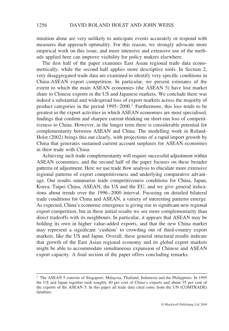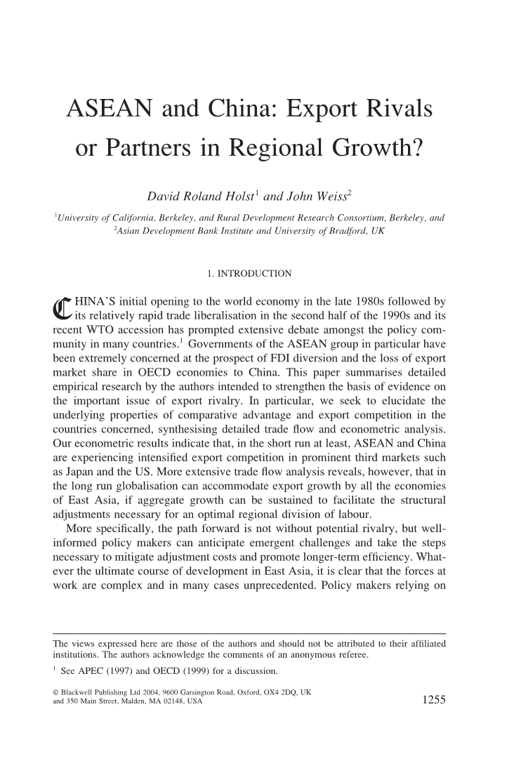 文章的前半部分考察东亚地区的贸易数据计量经济学,而下半部分更适用于描述性的工具。在第二章节,很详细的分解研究了贸易数据,以便识别在非常具体的条件下的中国-东盟出口竞争。在1995 - 2000年期间,我们得出实质性的和普遍失去大多数产品类别出口市场这样的结论.特别是,我们目前的估计程度主要中国出口产品在美国和日本市场,东盟经济体(东盟5)已经失去了市场份额。此外,这种损失往往在大量的出口活动中,尤其是东盟国家对于中国确认和增强目前的想法对短期的竞争力的损失。然而,长期来看, 东盟和中国之间有相当大的互补性潜力。在罗兰·霍尔斯特建模工作(2002年)得出了清楚的一点在中国大量进口的工程中产生了持续的经常账户盈余在东盟经济体与中国的贸易中。