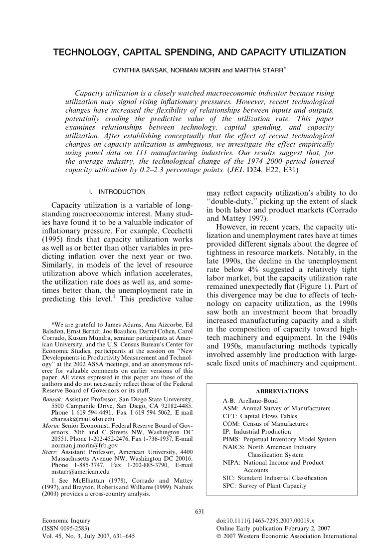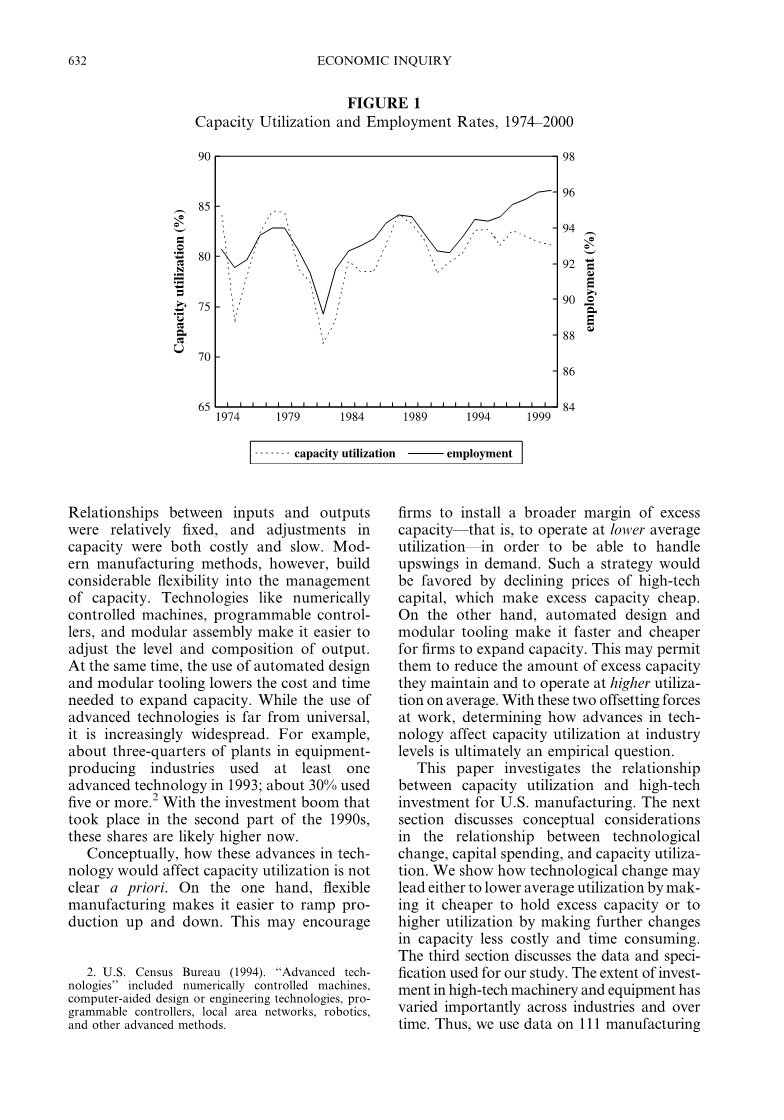 产能利用率是一个受到密切关注的宏观经济指标,因为利用率的上升可能意味着通货膨胀压力的上升。然而,最近的技术变化增加了 输入和输出之间关系的灵活性。潜在地侵蚀利用率的预测值。本文考察了技术、资本支出和产能利用之间的关系。在建立了最近的技术变化对产能利用的影响是模棱两可的概念之后,我们使用面板数据对111个制造业的影响进行了实证研究。我们的研究结果表明,1974-2000年平均工业的技术变化使产能利用率下降了0.2-2.3个百分点。(JEL D24, E22, E31)