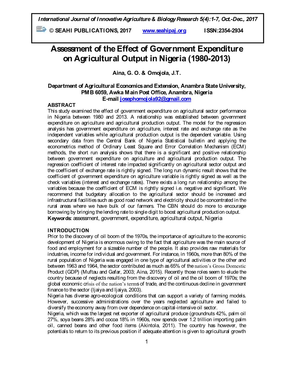 关键词:评估,政府,支出,农业产出,尼日利亚