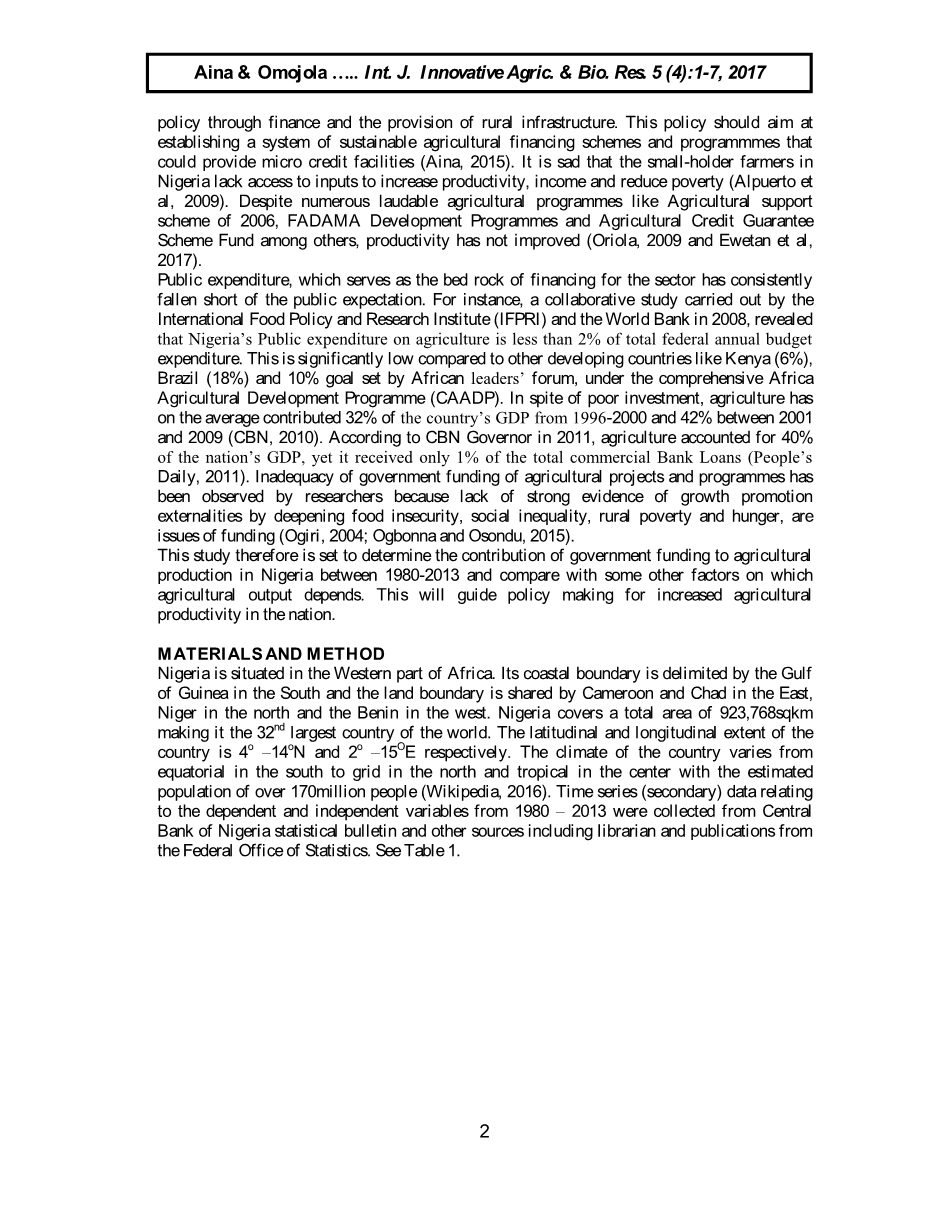 尼日利亚是最大的农产品净出口国(花生42%,棕榈油)。在20世纪60年代,27%的大豆、28%的大豆以及可可占18%,现在它的进口超过1.2万亿美元。油,罐装豆类和其他食品(Akintola, 2011)。但是,如果通过财政和提供农村基础设施来充分注意农业发展政策,该国就有可能恢复其先前的地位。政策应该瞄准建立可持续农业融资计划和可提供小额信贷的计划(Aina, 2015)。令人遗憾的是,尼日利亚的小农场主缺乏投入以提高生产力、收入和减少贫困(Alpuerto etal, 2009)。尽管有许多值得称赞的农业项目,如2006年的农业支持计划、FADAMA发展计划和农业信贷担保计划基金等,但农业生产率始终没有提高(Oriola, 2009和Ewetan et al,2017)。