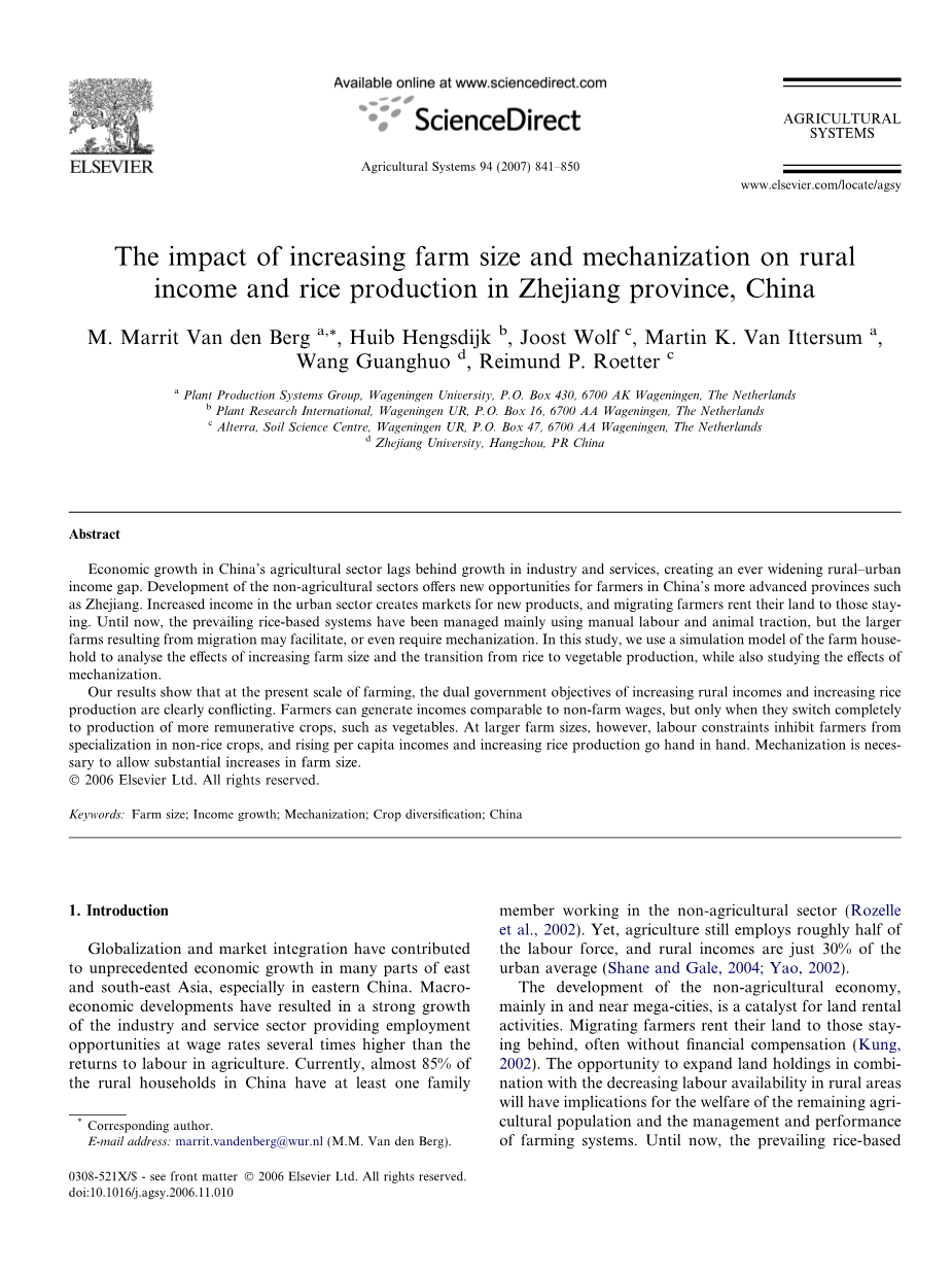 1. Marrit Van den Berg,Huib Hengsdijk, Joost Wolf , Martin K. Van Ittersum,Wang Guanghuo, Reimund P. Roetter