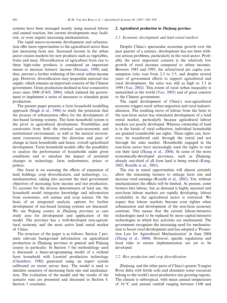 论文的结构如下。第二部分介绍了浙江省农业生产的相关背景资料,特别是浦江县的农业生产。在第三部分,讨论了研究方法:一种使用Leontief生产技术的程式化农场家庭的线性规划模型(Chambers, 1988),该模型使用了根据最近的调查数据校准的专家系统。该模型用于模拟扩大农场规模和加快机械化进程的场景。第四部分给出了模型评价并呈现、讨论运行结果。第五部分是总结。