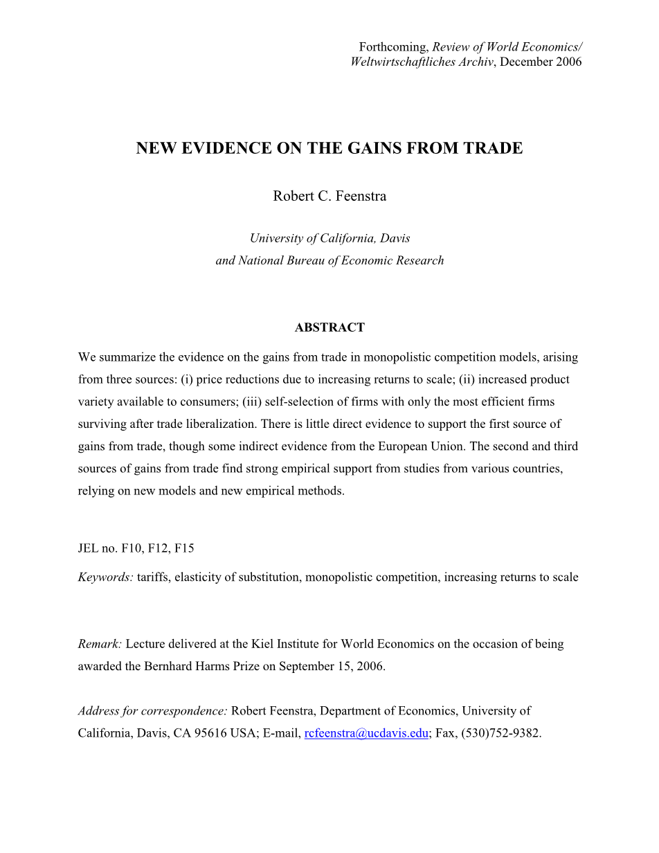 1980年代初通过引入规模经济和垄断竞争,国际贸易理论发生了现代化变革。自Helpman(1981),Krugman(1979, 1980, 1981)和Lancaster(1980)的首篇文章发表已经有大概25年了,回顾和探究这些模型产生的影响是合理的。1980年代的静态模型在理论方面的影响非常大, 促成了1990年代内生增长的动态模型的形成,以及当前十年在国际贸易与国际宏观经济学领域都有应用的异质性企业模型的出现。但是今天下午我的兴趣并非在这些模型的理论贡献,而是近期这类模型有所发展的实证效用。