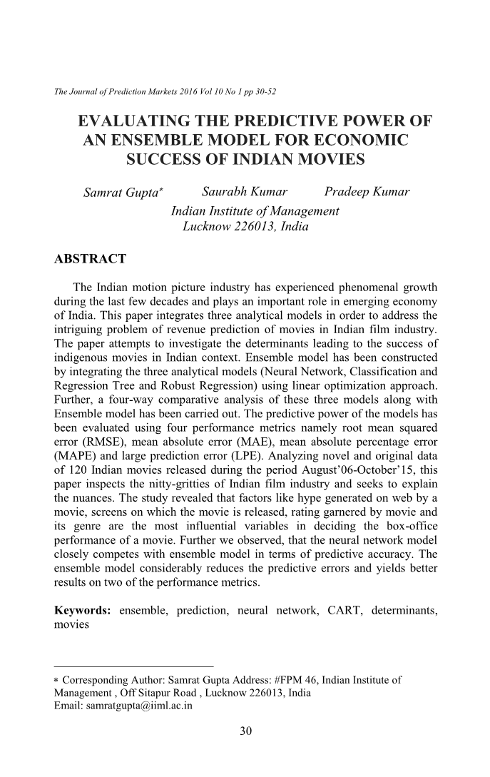 在过去的几十年中,印度电影产业出现了惊人的增长,并且在印度新兴经济中扮演着重要的作用。本文综合了三种分析模型,以解决印度电影产业中电影收入预测这一有趣的问题。本文试图调查导致本土电影在印度环境中成功的决定因素。集成模型已经通过整合三个分析模型(神经网络,分类和回归树和稳健回归)建立并采用线性优化方法。这三个模型的四方面比较分析集成模型已经开展。模型的预测能力有 使用四个性能指针进行评估,即均方根误差(RMSE),平均绝对误差(MAE),平均绝对百分比误差 (MAPE)和大预测误差(LPE)。本文分析了在06年8月至10月15日期间发行的120部印度电影的小说和原始资料,而且检验印度电影产业的本质并力求解释其中的细微差别。研究表明电影的网络炒作、电影发行的银幕、电影获得的评分和电影类型等要素是决定一部电影票房表现的重大影响因素。通过我们的进一步观察,神经网络模型在预测准确性方面与集成模型密切相关。集成模型大大降低了预测误差并对两个性能指针的结果产生了更好的效果。