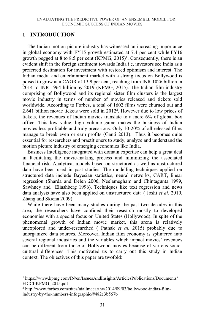虽然在过去的二十年中许多的研究人员将其在这一领域中的研究主要限于发达经济体尤其是美国(好莱坞)。尽管印度的电影产业惊人增长,这个领域相对来说还是有未开发和研究不足的地方( Pathak 等人 2015),这很可能源于数据资源无组织。此外,印度的电影经济也因为各种社会文化差异分裂成几个区域产业和影响电影收入的变量。这促使我们在印度环境下进行这项研究。本文有两个目的: