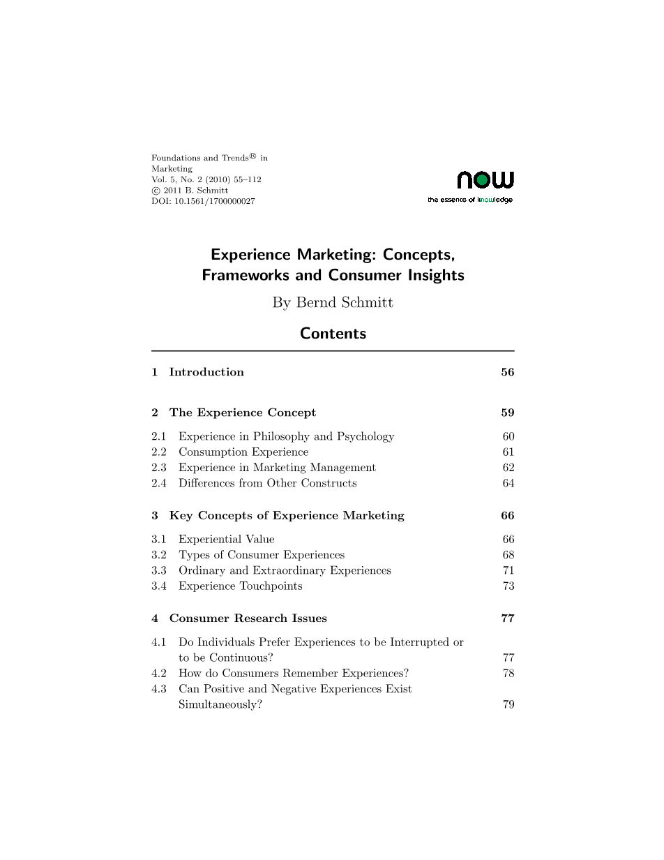 第一篇详细讨论和概念化营销体验的学术文章是霍尔布鲁克和Hirschman(1982)“消费的体验方面:消费者的幻想、感受和乐趣”,将他们的文章定位于信息处理霸权视角下的消费者研究,Holbrook和Hirschman认为信息处理被忽视的重要消费现象包括幻想,感觉和乐趣——包括好玩的休闲活动、感官愉悦、白日梦、审美享受和情感反应。根据前面描述的哲学观点,作者认为这种体验观在精神上和精神上都是现象学的认为消费是一种主观意识状态。与强调产品属性、功利功能、意识和言语思维的信息处理观点不同Holbrook和Hirschma(1982)的体验观强调象征意义、潜意识过程和非语言线索由消费引起的。