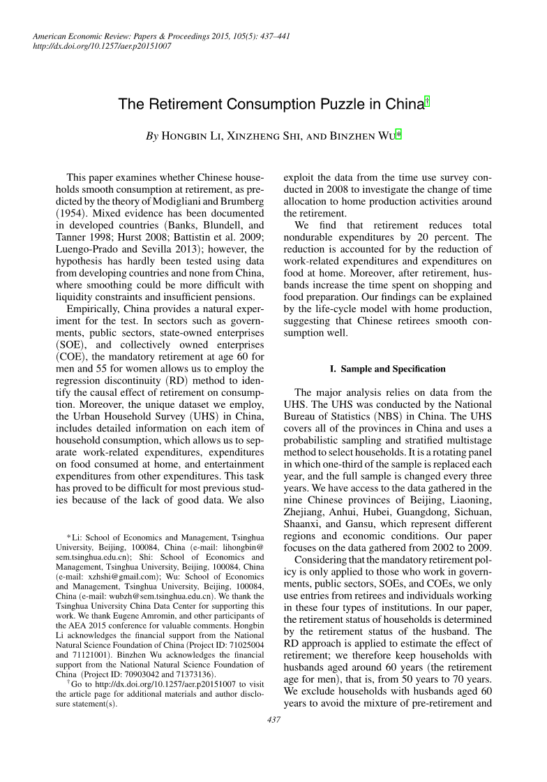 本文考察了中国家庭退休后的消费是否平稳,正如莫迪利亚尼和布伦伯格(1954)的理论所预测的那样。对发达国家研究得出的结论来看有多种情况(Banks, Blundell, and Tanner 1998; Hurst 2008; Battistin et al. 2009; Luengo-Prado and Sevilla 2013);然而,这一假设几乎没有得到来自发展中国家的数据的检验,也没有来自中国的数据,因为在中国,由于流动性限制和养老金不足,消费平稳可能更加困难。