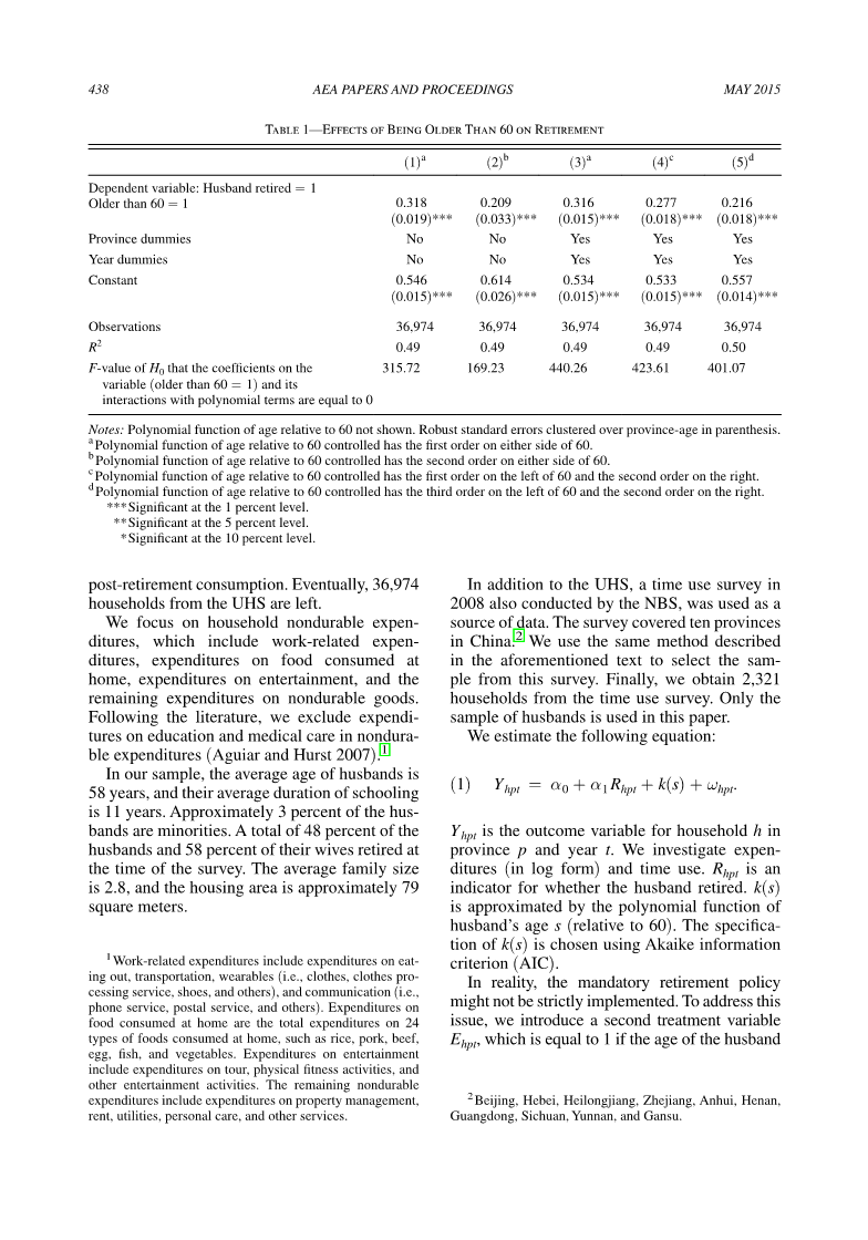 Yhpt是p省和t年家庭h的结果变量。我们调查支出和时间使用。Rhpt是丈夫是否退休的一个指标。k(s)近似于丈夫年龄s的多项式函数(相对于60岁)。采用赤池信息准则(AIC)选择k(s)的标准。在现实中,强制性退休政策可能不会得到严格执行。为了解决这个问题,我们引入了第二个处理变量Ehpt,如果丈夫的年龄等于1表示大于60岁,小于60岁等于0。为了得到这一效应的无偏估计,我们使用Ehpt作为R的一个工具。