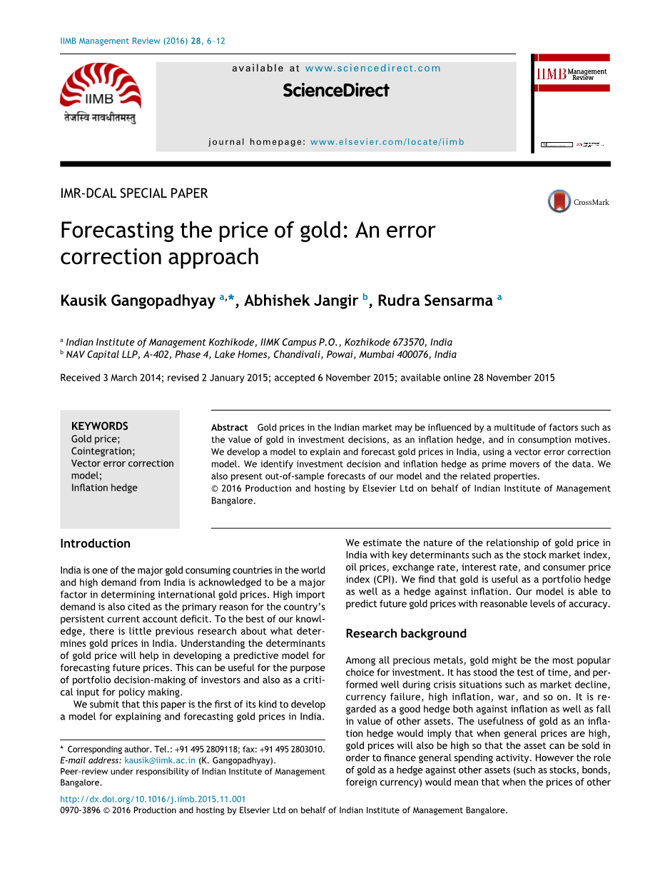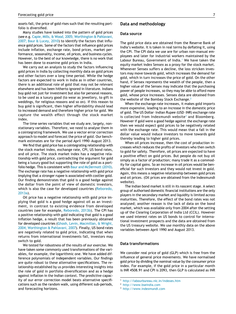 在所有贵金属中,黄金可能是投资最热门的选择。它经受住了时间的考验,在如市场萧条,货币失灵,高通货膨胀,战争等危机情况下都表现得很好。它被认为是针对通货膨胀以及其他资产价值下跌的一个很好的防范。黄金作为通货膨胀的有效性意味着当一般价格高,黄金的价格也高,这使得资产可以被销售给一般支出活动从而获得金钱。但是黄金作为其他资产(如股票,债券,外汇)的对冲作用将意味着,当其他资产的价格下跌,黄金价格上涨导致证券资产组合多样化。许多研究都调查了黄金价格的模型来确定影响黄金价格的因素。一些影响黄金价格的因素包括通货膨胀,汇率,债券的价格,市场表现,季节性,收入,油价上涨,以及经济周期。然而,据我们所知,没有人做过审查印度黄金价格的工作。