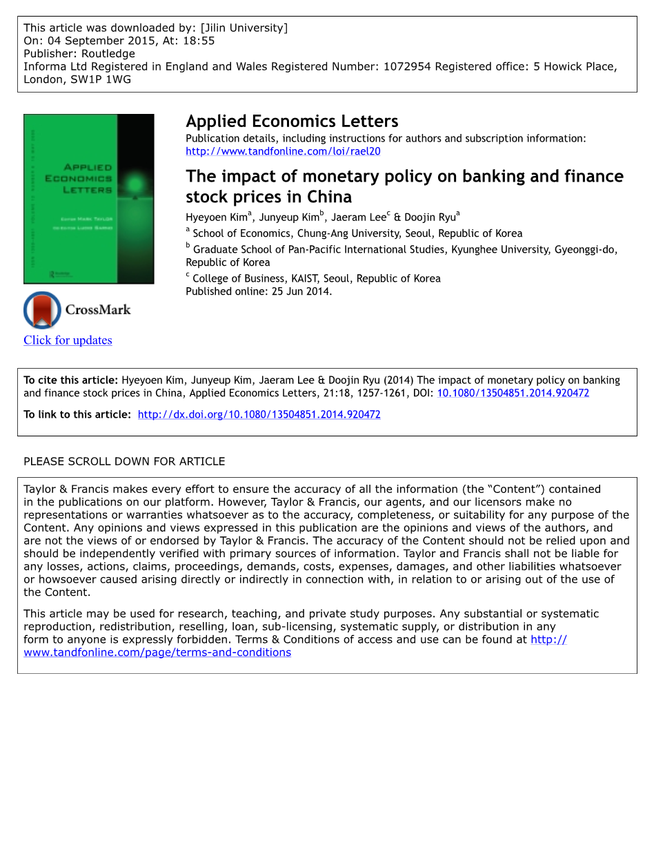 摘要:在这项研究中,我们使用多方差比检验和向量误差修正模型,研究了2007年至2012年中国银行业和金融股票价格所需存款准备金率(RRR)变化的影响。有效市场假说在上海A股市场早期上调存款准备金率(2007-2008)期间遭到拒绝,A股价格对准备金率上升产生负面影响。相反,上海A股和香港H股市场都是有效的,在稳定的RRR(2009-2010期间)以及最近RRR(2010-2012期间),RRR的负面影响并未被清晰地观察到。