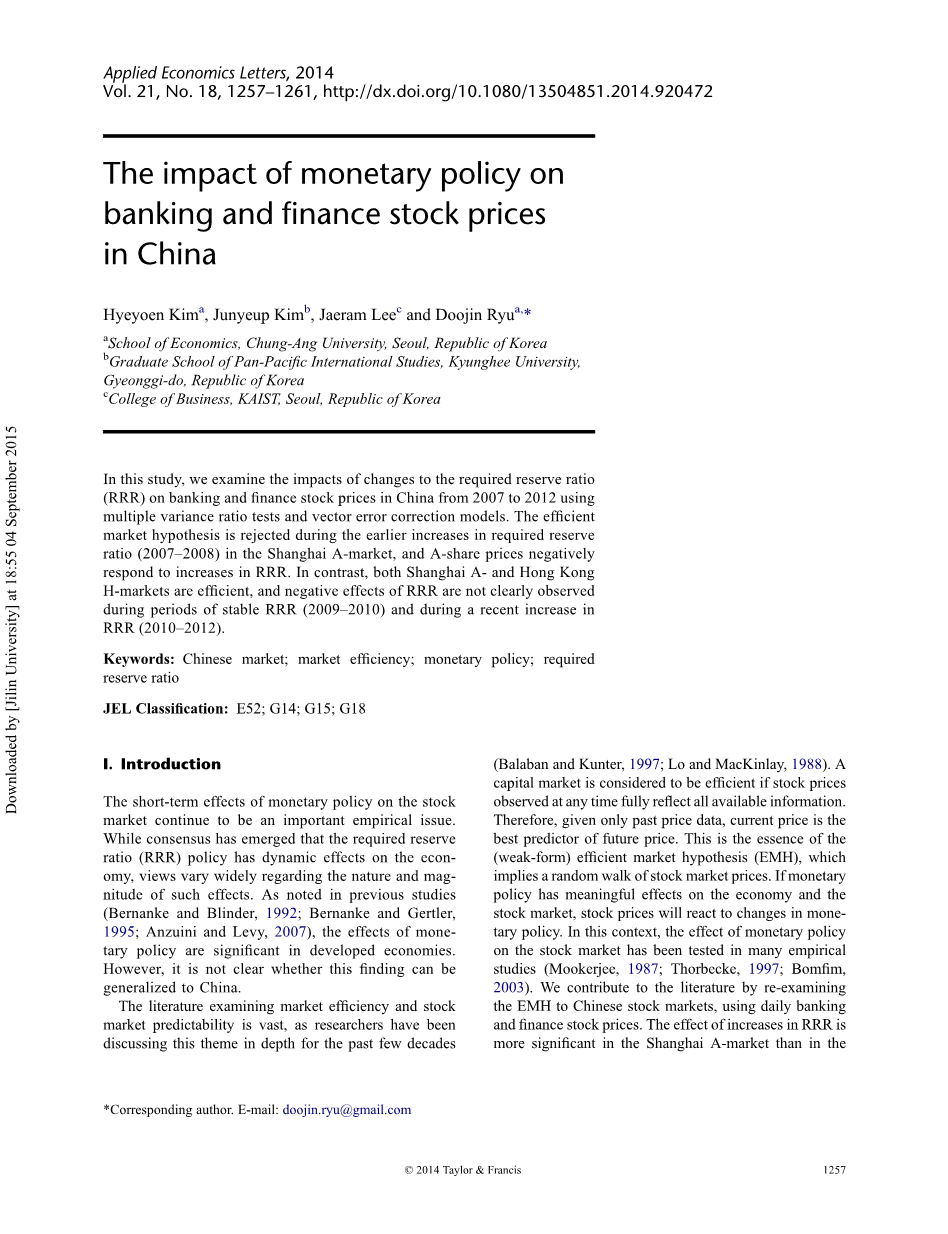 正如以前的研究(伯南克和布林德,1992;伯南克和格特勒,1995;安祖尼和莱维,2007)所指出的那样,货币政策的影响在发达经济体中具有重要意义。但是,这个发现是否可以推广到中国尚不清楚。研究市场效率和股票市场可预测性的文献是巨大的,因为过去几十年来研究人员一直在深入讨论这个主题(Balaban和Kunter,1997; Lo和MacKinlay,1988)。资本市场被认为是有效的,如果股票价格观察到任何时候都可用的信息。因此,只有过去的价格数据,当前价格才是未来价格的最佳预测指标。这是(形式弱的)有效市场假说(EMH)的实质,它暗含着货币市场价格的实践。如果货币政策对经济和股票市场产生有意义的影响,股票价格将对货币政策的变化做出反应。在这种情况下,货币政策对股票市场的影响已经在许多实证研究中得到验证(Mookerjee,1987; Thorbecke,1997; Bom fi m,2003)。我们通过使用日常银行业务和金融证券市场重新审视EMH到中国股票市场,为文献做出贡献。在上海A股市场中,增加RRR的效果对于中国股市来说更为重要香港H股市场虽然在各个时段的幅度都不相同,