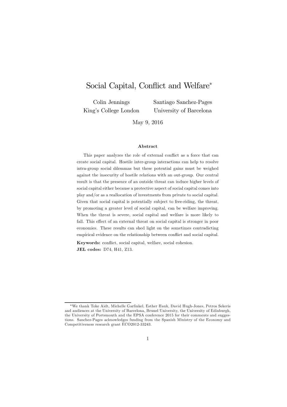 这篇论文分析了外在冲突作为一种能够创造社会资本的力量而扮演的角色。敌对的组间交流有助于解决组内的社会困境,但是这些潜在的利益必须要与一个组外敌对关系的不安全性相权衡。我们的中心结论是:一个外在威胁的出现能够引起更高水平的社会资本,这要么是因为社会资本所扮演的一种保护性角色,要么就是从个体到社会资本的投资额再分配。假定社会资本潜在地受支配于搭便车问题,那么通过把社会资本提高到更高的水平,这个威胁可能会改善社会福利。