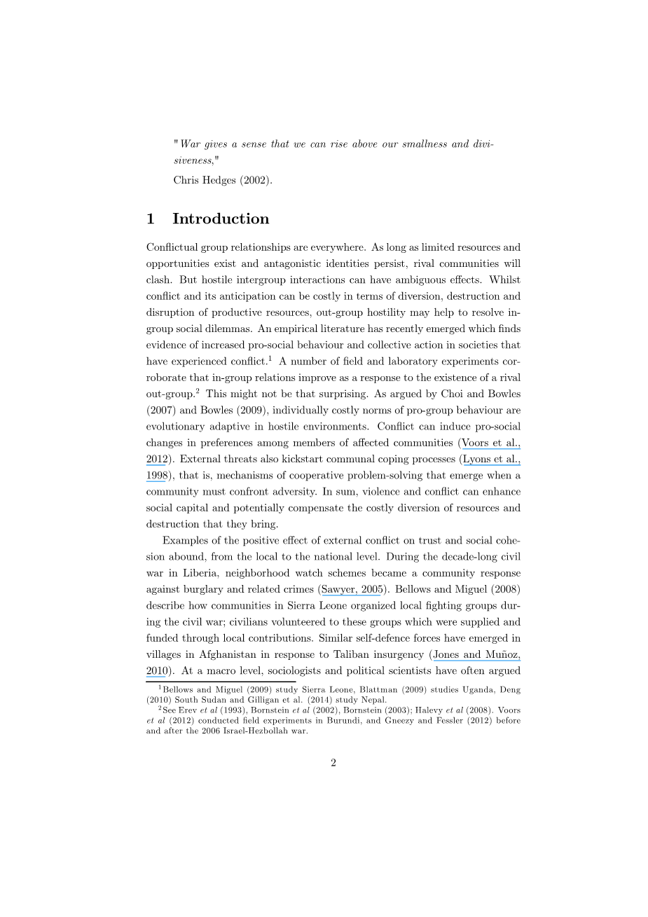 我们提出的这个理念是:外部冲突是一个能够创造社会资本的力量,并且在一些情况下能提升社会福利。在我们的定义下,社会资本有四个关键属性。首先,它能够提升私人资本的生产性。第二,它有一项公益性(科尔曼,1988),因此它通常供给不足。第三,正如先前提到的实验室和实地实验所表明的那样,作为对一个外群体出现的反应,社会资本能够强化集体行为和社会凝聚力。最后,社会资本对生产来说也是高花费的;它的形成需要时间和努力的重要投资。(布尔迪,1994)。