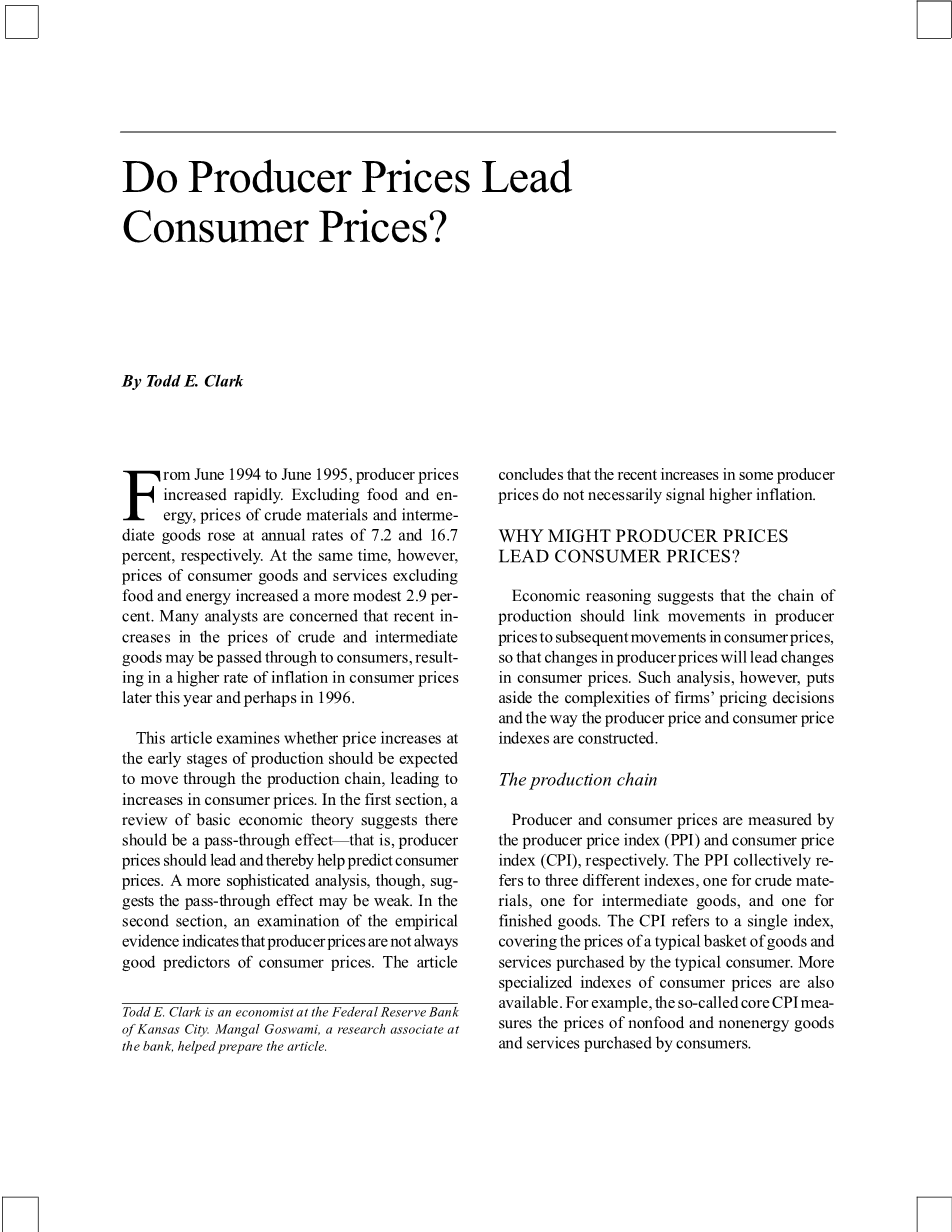 本文探讨了在生产的早期阶段对价格上涨情况的预测,即生产链会导致消费价格的上涨。文章的第一部分,回顾了一个基本的经济理论,提出了生产价格的领先对消费价格产生影响,从而有助于对消费价格进行预测;第二部分首先提出了一个更复杂的分析,表明通过作用可能较弱,又用一个检验的经验证据,分析得出生产价格并不总能很好地预测消费价格。最终,本文得出的结论是:最近一些生产商品价格的上涨趋势,不一定是产生更高通货膨胀的信号。