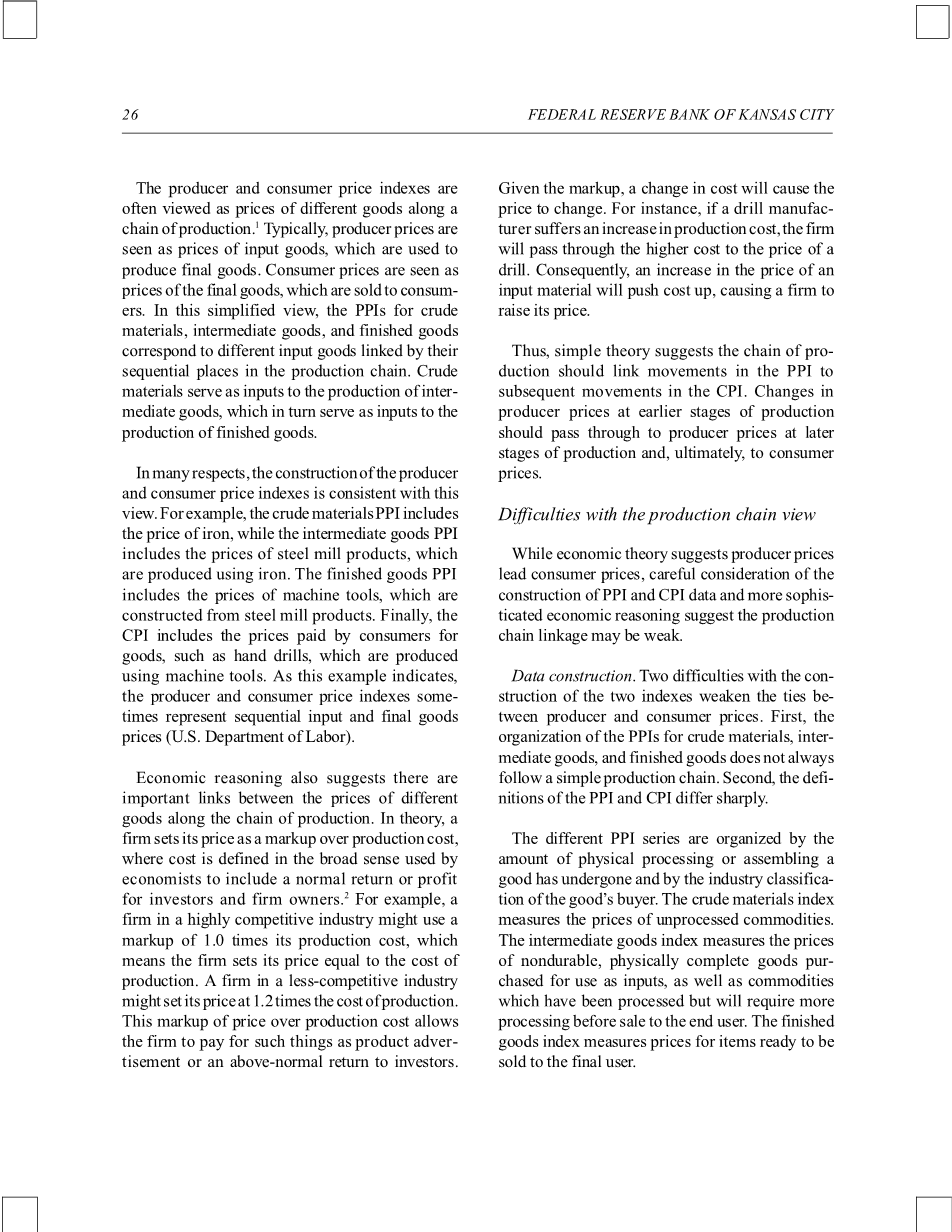 一些分析家认为,近期原油价格和中间产品价格将通过生产链上涨,并产生更高的消费价格通胀。简单的经济学认为,这种传递效应是可能发生的,但如果为了谨慎考虑,采纳更复杂的PPI和CPI数据推理,任何传递效应的影响都可能会相应的减弱。研究者们在进行了与此一致的更复杂的分析之后,相关的实证结果显示出生产链与消费者、生产价格的弱链接。PPI的变化有时可以帮助预测消费物价指数的变化,但不能将其应用于系统之中。因此,近期增加的一些生产者物价指数,其本身并不能预示出更高的通货膨胀。