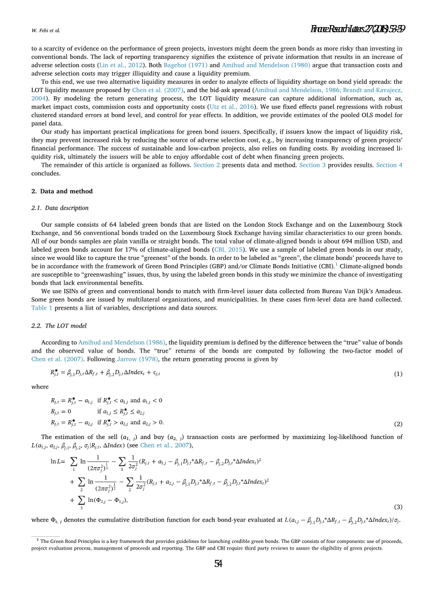使用特定的债券固定债券i进行固定效果面板回归(模型3)。债券类型和流动性指标的相互作用使我们能够确定绿色债券或传统债券的特定流动性风险对收益率差价的影响。最后,我们将年度和LOT流动性之间的交互变量包括在内,并仅对绿色债券进行估计(模型4)。