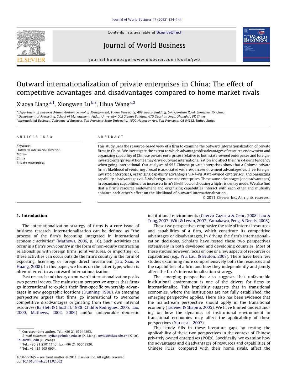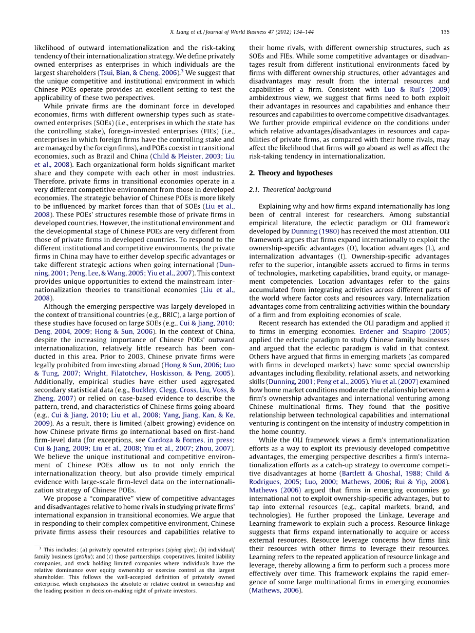 本研究填补了这些文献的差距,通过测试这两种观点在汉语语境中的适用性民营企业(民营企业)。具体来说,我们研究如何资源和能力的优缺点中国的民营企业,拥有国内竞争对手相比,外向国际化的可能性和影响的风险国际化战略趋势。我们定义的私人国有企业作为个人大股东(Tsui, Bian, amp; Cheng, 2006)。[3]我们建议独特的竞争和制度环境中国民营企业的运作提供了一个良好的环境来测试这两种观点的适用性。