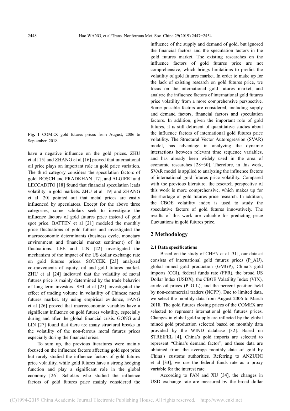 关于黄金价格波动影响因素的文献主要分为三类。第一类从供求角度研究黄金期货价格波动。例如,BATCHELOR和GULLEY[2]分析了珠宝需求与黄金价格之间的关系。KANJILAL和GHOSH[3]证明了黄金进口需求在短期内会对黄金价格产生影响。此外,STREIFEL[4]和OWUSU等人[5]发现,中国在全球市场的地位及其对自然资源的追求推动了包括黄金在内的初级商品价格的上涨。第二类是财务因素。随着商品指数基金、高频交易策略和电子信息技术的发展,近年来商品市场金融化趋势日益明显[6minus;8]。在此背景下,许多学者将研究重点放在影响金价波动的金融因素上,主要考虑汇率变动、利率冲击和油价联动等因素。在CAPIE等人[9]提出黄金是对美元的对冲之后,一些学者[10minus;12]通过实证研究证明黄金价格与美元汇率之间存在负相关关系。WANG和CHUEH[13]以及HASSANI等人[14]证明利率对黄金价格有负面影响。ZHU等人[15]和ZHANG等人[16]证明了国际油价在黄金价格变动中起着重要作用。第三类考虑黄金的投机因素。BOSCH和PRADKHAN[17]以及ALGIERI和LECCADITO[18]发现金融投机导致黄金市场的波动。ZHU等人[19]和ZHANG等人[20]指出,金属价格很容易受到投机者的影响。除了上述三类之外,一些学者试图研究黄金期货价格的影响因素,而不是黄金现货价格。BATTEN等人[21]对黄金期货的月度价格波动进行了建模,并研究了其波动的宏观经济决定因素(商业周期、货币环境和金融市场情绪)。LEE和LIN[22]研究了美元汇率对黄金期货价格的影响机制。SOUČEK[23]分析了股票、石油和黄金期货市场的共同走势。ZHU等人[24]指出,金属期货价格的波动主要由长期投资者的交易行为决定。SHI等人[25]研究了交易量对中国金属期货市场波动性的影响。FANG等人[26]通过实证研究证明,宏观经济变量对黄金期货的波动性有显著影响,特别是在全球金融危机期间和之后。龚和林[27]发现,有色金属期货价格的波动存在许多结构性突破,特别是在金融危机期间。