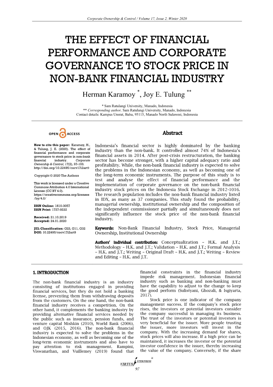 良好的公司治理机制的实施可以提高公司财务报表的质量。高质量的财务报表必须为投资者的经济决策和投资决策提供相关有用的信息,遵守公认的会计准则,不造假、不造假。全国公司治理政策委员会(2004)指出:“治理体系包含五个主要原则;这些是:透明度、问责制、责任、独立、和公平”(p。3)。预计该公司治理机制来增加thesupervision公司,包括managerialownership机构所有权,董事会ofcommissioners,董事会的规模,审计委员会的存在,一个独立委员会委员。基于这个研究背景,我们想解决和分析财务的影响公司绩效与执行非银行金融行业股票治理2012-1016年印度尼西亚证券交易所的价格。