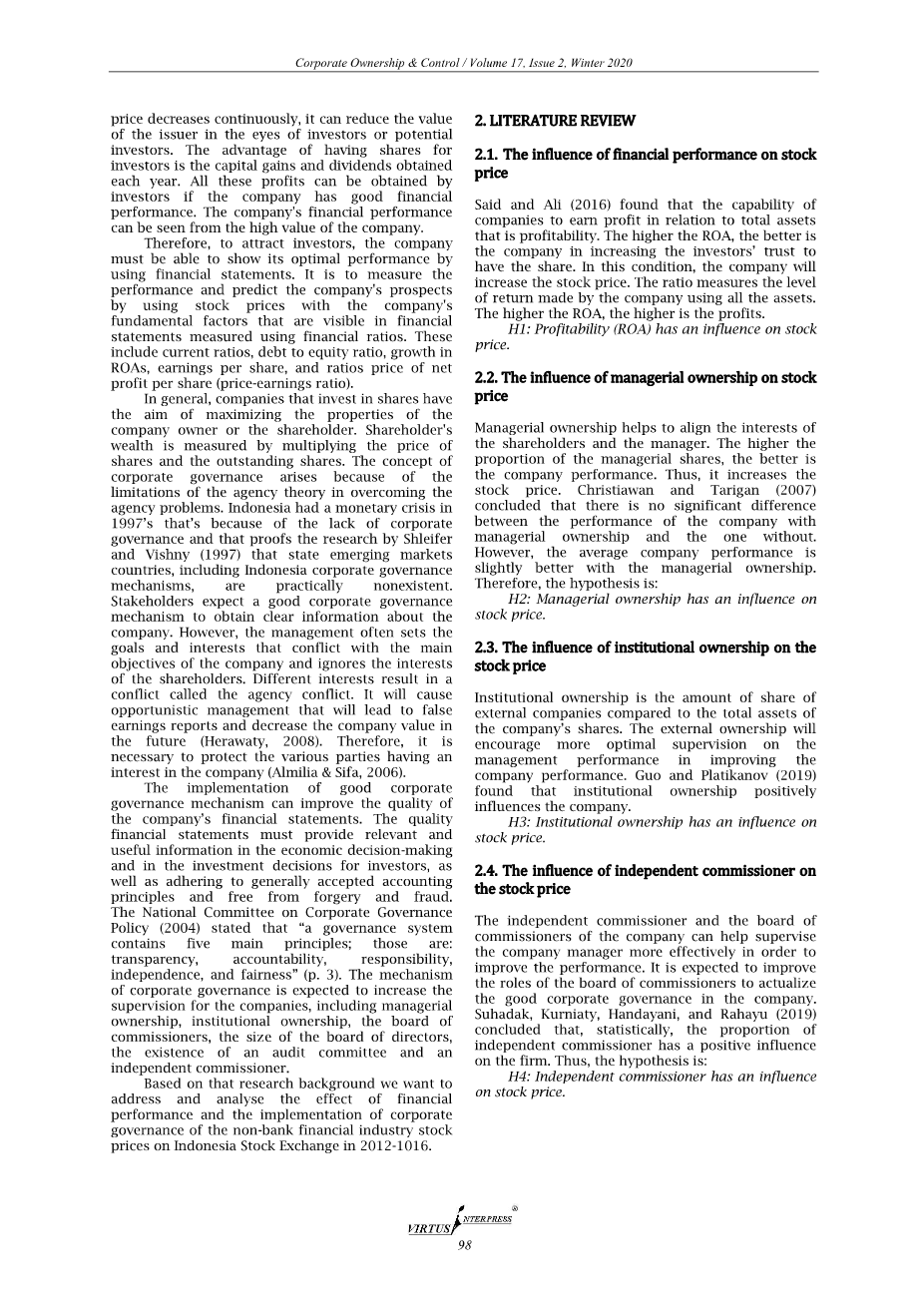 2.4独立委员对股票价格的影响公司的独立委员和监事会可以帮助更有效地监督公司经理,以提高业绩。提高监事会的作用,实现良好的公司治理。suhaak, Kurniaty, Handayani, and Rahayu(2019)得出结论,统计上,独立委员的比例对公司有积极的影响。因此,假设为:H4:独立委员对股票价格有影响。