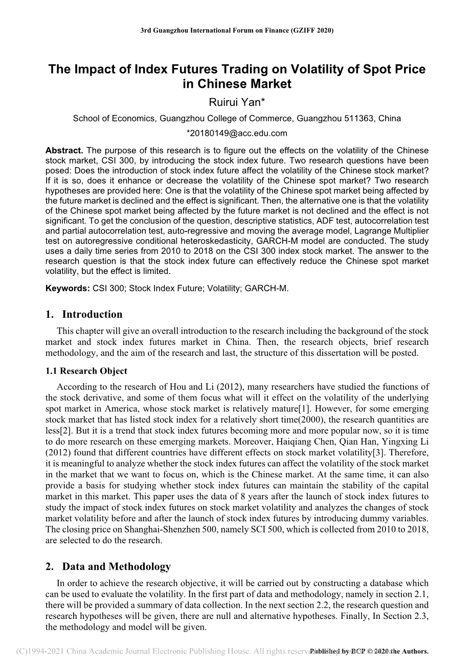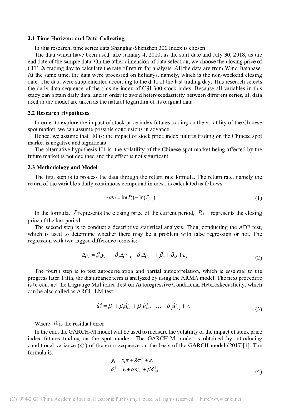 根据Hou和Li(2012)的研究,许多研究人员已经研究了股票衍生品,其中一些关注其将对标的物的波动性产生什么影响现货市场相对成熟的美国现货市场[1]。但是,对于一些新兴股票指数上市时间较短(2000年)的证券市场,研究数量为更少[2]。但是现在股指期货越来越流行,这是时候在这些新兴市场上做更多的研究。此外,陈海强,韩谦,李应兴(2012)发现不同的国家对股票市场的波动有不同的影响[3​​]。所以,分析股指期货是否会影响股票市场的波动性是有意义的在我们要关注的市场上,那就是中国市场。同时,它也可以为研究股指期货能否维持资本稳定提供基础这个市场中的市场。本文使用股指期货推出后8年的数据研究股指期货对股票市场波动的影响并分析股票的变化通过引入虚拟变量,在推出股指期货之前和之后的市场波动性。沪深500的收盘价(即SCI 500)是从2010年至2018年收集的,被选中进行研究。