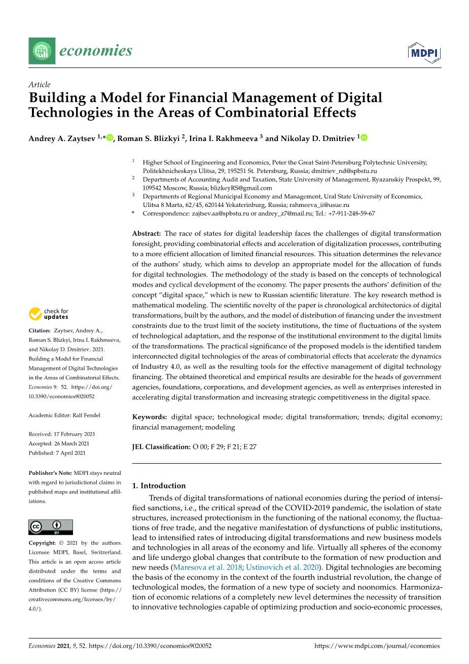 Abstract: The race of states for digital leadership faces the challenges of digital transformation foresight, providing combinatorial effects and acceleration of digitalization processes, contributing to a more efficient allocation of limited financial resources. This situation determines the relevance of the authorsrsquo; study, which aims to develop an appropriate model for the allocation of funds for digital technologies. The methodology of the study is based on the concepts of technological modes and cyclical development of the economy. The paper presents the authorsrsquo; definition of the concept “digital space,” which is new to Russian scientific literature.