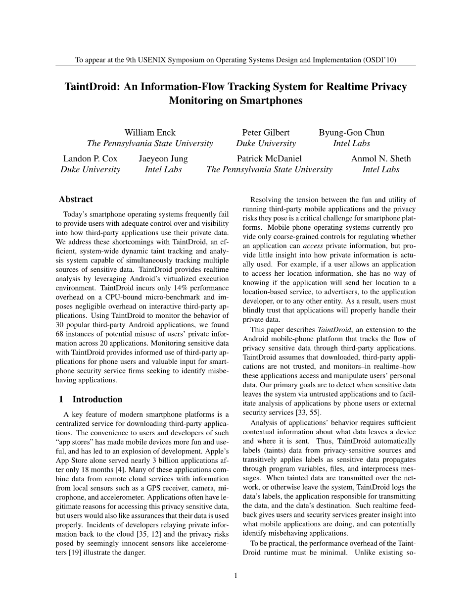 今天的智能手机操作系统经常不能为用户提供足够的控制,也不能让用户了解到第三方应用程序将如何使用他们的私人数据。我们将用TaintDroid解决这些不足,它是一种有效系统的、宽动态污点跟踪和分析系统,能够同时跟踪多个敏感数据源。通过利用安卓的虚拟化执行环境,TaintDroid可以提供实时分析。TaintDroid会带来14%的CPU绑定的微基准性能开销,在第三方应用程序中,这种开销是可以忽略不计的。通过使用TaintDroid监测30个流行的第三方应用程序的行为,我们发现在其中的20个应用程序中,用户的私人信息可能被滥用的情况有68次。利用TaintDroid监测第三方应用程序的敏感数据,对于寻找出可能存在的异常行为,我们可以为手机用户和手机安全服务公司提供了宝贵的意见。