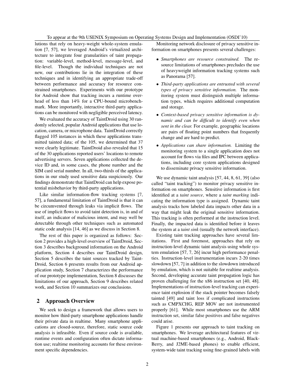 本文的其余部分安排如下:第2节提供了一个高层次的概述TaintDroid,第3节介绍了在Android平台上的背景信息,第4节描述了我们的TaintDroid设计,第5节介绍了污染源的污染-机器人跟踪,第6节从我们的Android应用研究结果,第7节是我们的原型实施绩效,第8节讨论了我们的方法的局限性,第9节和第10节描述的相关工作,总结了我们的结论。