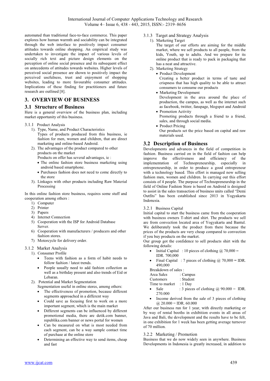 时尚领域竞争不断发展与进步。在时尚领域进行的业务可以帮助提高实施技术创业的有效性和效率,特别是在创业方面,以创造一个以技术为基础的优秀企业家。这个业务目前正在销售时尚男装、女装和童装,这项工作由4个人负责。基于Android的在线时装商店的设计和实施领域的科技创业的目的是为了帮助2013年成立于印度尼西亚日惹的被称为“黛米服饰”的商业单位的销售交易